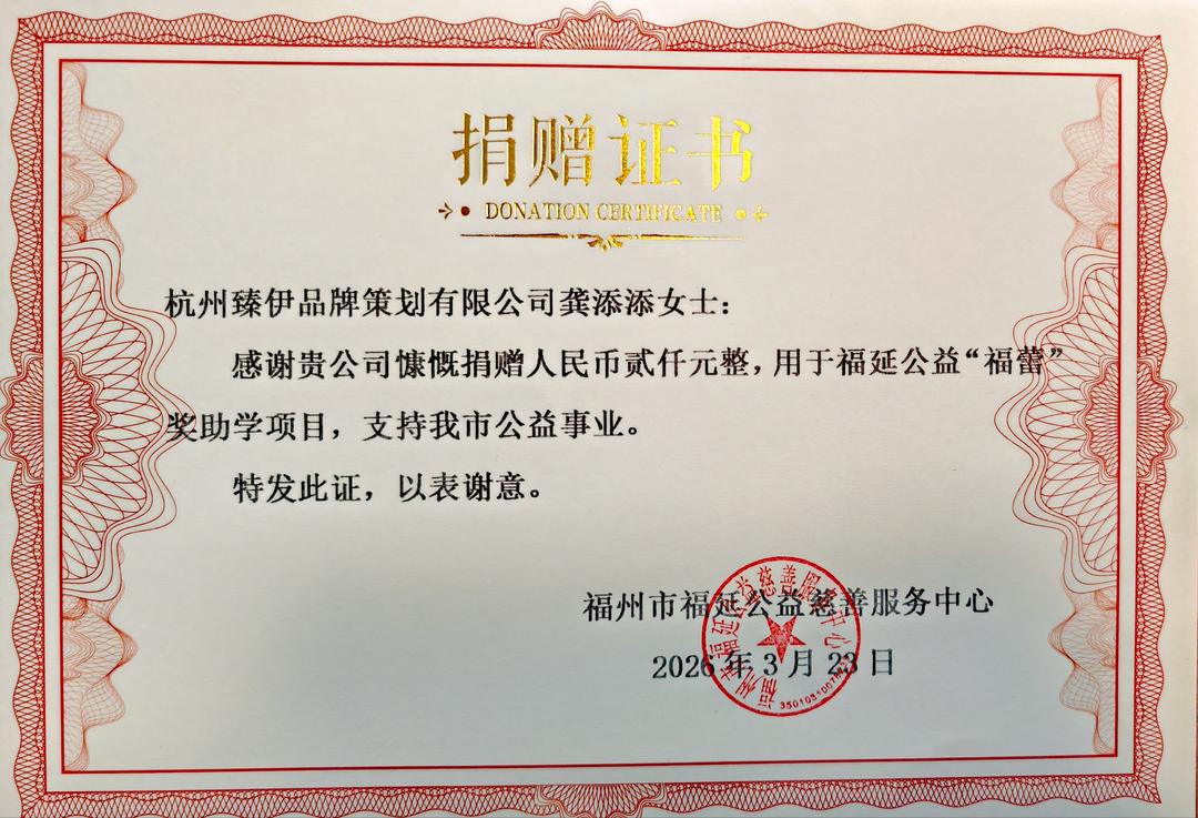 福延公益寄给杭州臻伊品牌策划有限公司董事长龚添添女士的捐赠证书