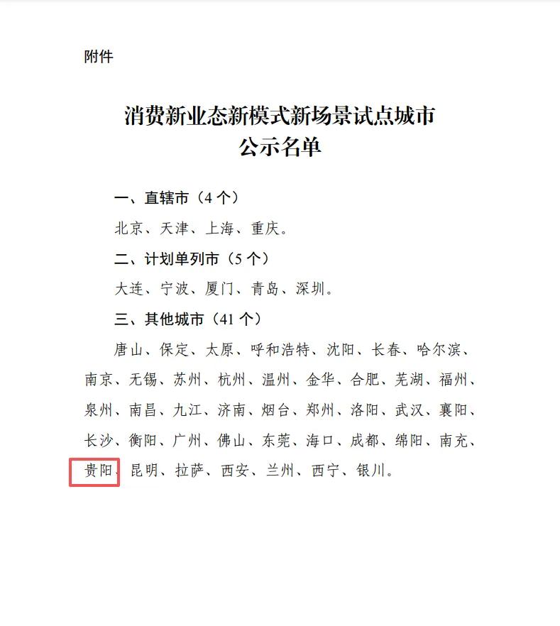 据商务部官网11月20日消息,根据《财政部 商务部关于开展消费新业态新模式新场景试点工作的通知》要求,商务部、财政部组织对各省(自治区、直辖市、计划单列市)推荐申报的75个城市进行了竞争性评审。贵阳作为拟入选消费新业态新模式新场景试点城市名单予以公示,公示时间为11月20日至28日。