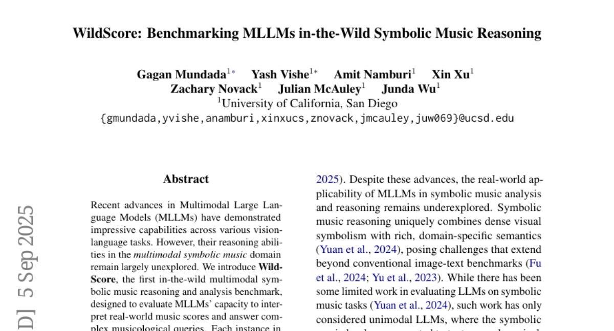 你有没有过这样的经历:看着一张乐谱,明明上面的音符、节拍记号都清清楚楚,但就是不知道它到底想表达什么音乐情感?现在的人工智能也遇到了同样的困扰。最近,加州大学圣地亚哥分校的研究团队就发现了一个有趣的现象:那些在回答问题、理解图片方面表现出色的AI大模型,在面对音乐乐谱时却常常"抓瞎"。
