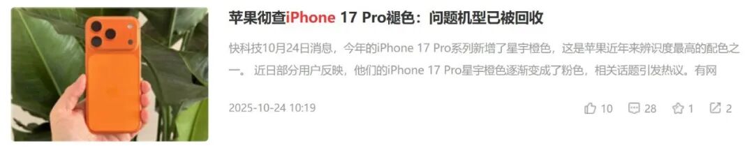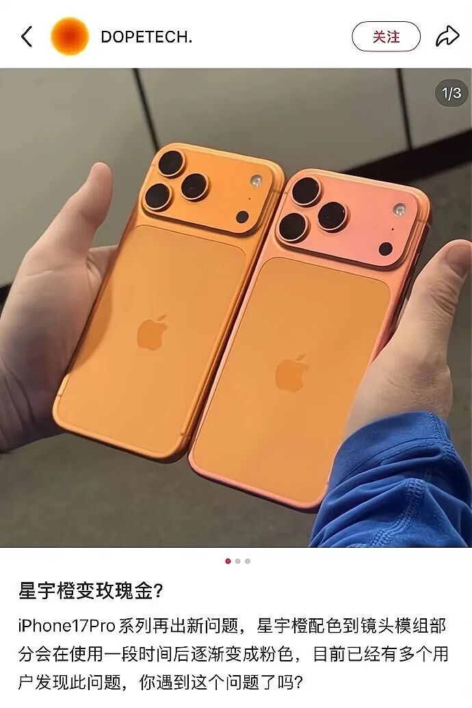 近日,iPhone 17 Pro 和 iPhone 17 Pro Max 的“褪色”现象在社交媒体上引发了广泛关注,尤其是其备受追捧的橙色版本,在使用一段时间后竟逐渐转变为粉色或玫瑰金色,让不少用户感到错愕。这一现象不仅暴露了产品在生产工艺上的隐患,更引发了业界对苹果供应链管理能力的重新审视。