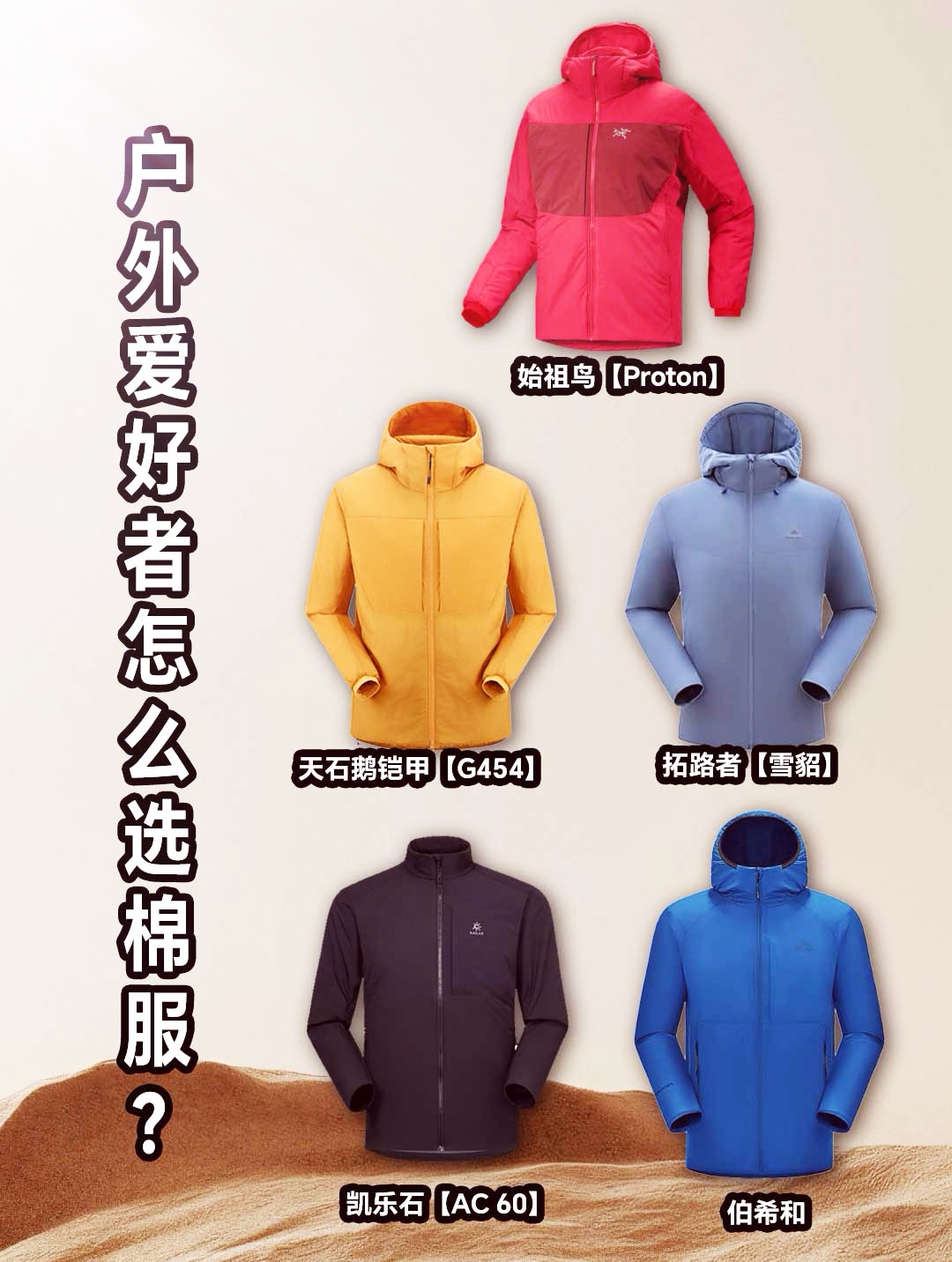 说了这么多,很多户外小白大部分认为,既然是为了保温,我穿羽绒服不一样可以吗?其实不然,最近几年羽绒价格飞涨,首先是羽绒服性价比并不高,再者遇到雨雪天气,羽绒一旦被浸湿,就失去了保温的作用,甚至还会变得更加冰冷。尤其是户外活动,气候变化不可预测,突遇暴风雨,户外棉服防风防水的优点,是羽绒服替代不了的。这也是为什么最近几年,那么多的户外爱好者,均义无反顾地选择了户外棉服。而以上五款棉服,两款作为定价高端的产品,如果没有特别极端的需求,除非是大款可以闭眼入。 其实我更倾向于后三款,作为我们日常使用或者偶尔探险。性价比懂的都懂,在目前国际环境下,省到就是赚到。天石鹅铠甲的G454在这几款里面是算性价比高的了,毕竟一线的品质入门的价格谁不喜欢呢?