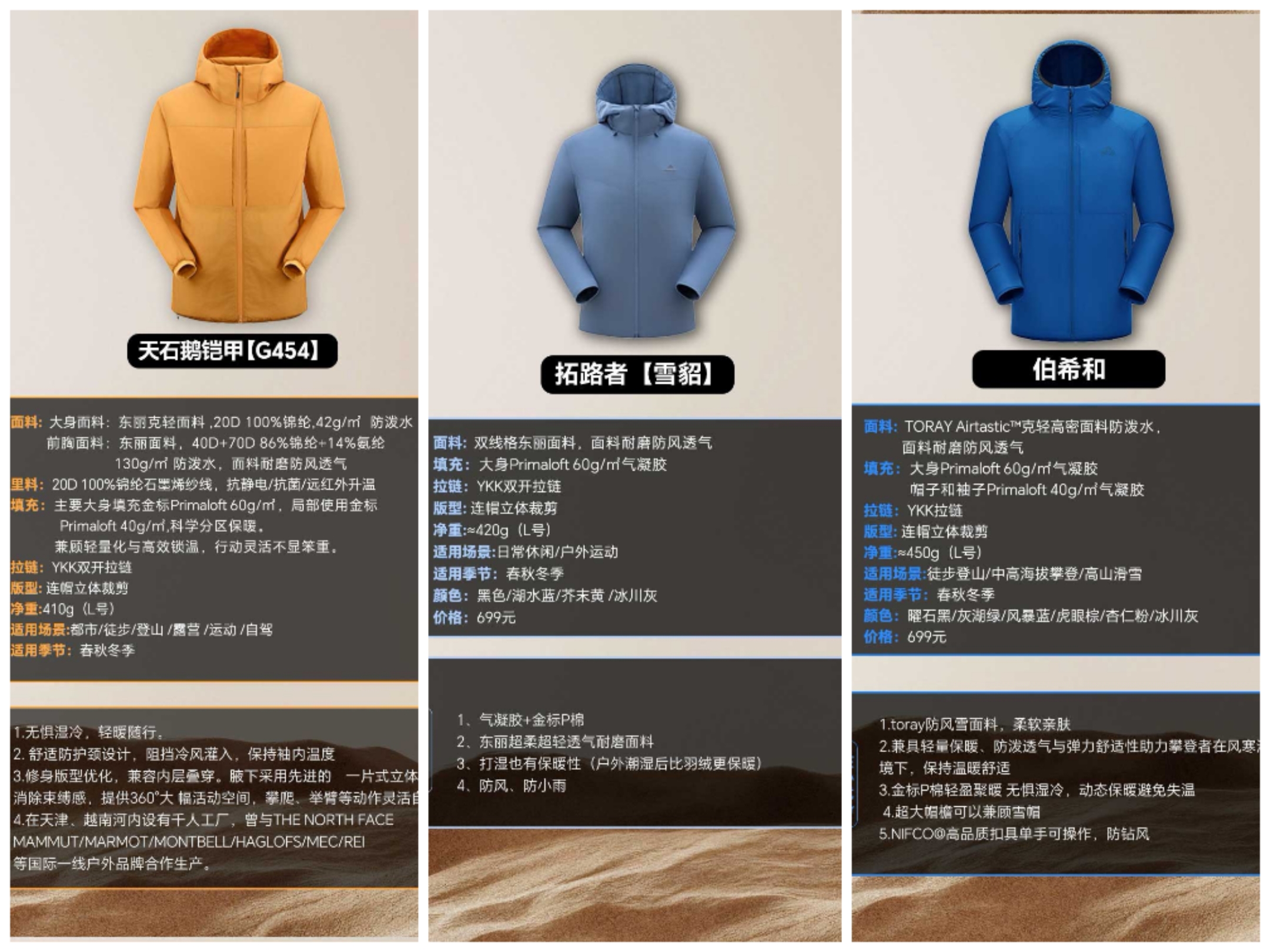 始祖鸟:测试型号为Proton 。面料材质为Fortius Air 50锦纶/氨纶;拼布为锦纶/氨纶平纹机织物;里料为20D平纹布-锦纶;填充物为聚酯纤维。对比型号均为L号,重量400g左右。使用场景多为野外滑雪,单板滑雪,防风透汽。裁剪工艺特点,腋下采用先进的一片式立体剪裁工艺,消除束缚感适合大幅度活动,防泼水面料不惧风雨,选用YKK拉链。