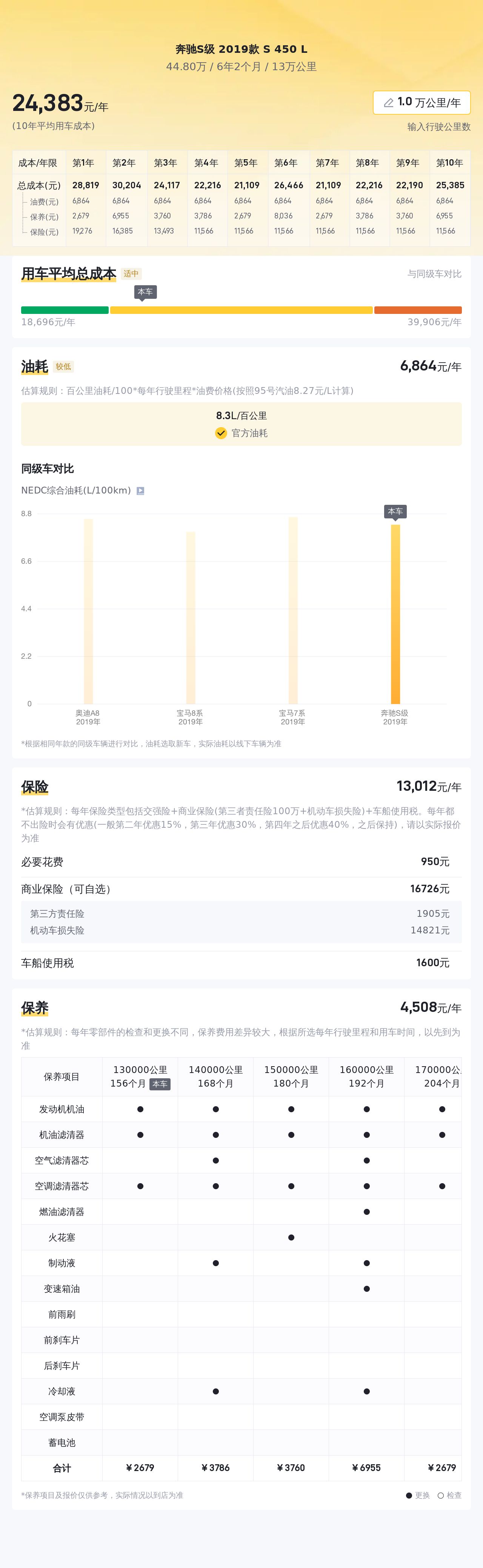 据估算,奔驰S级 2019款 S 450 L的用车成本较低,因为同级车的最低用车成本是23659元/年,最高是40684元/年,奔驰S级 2019款 S 450 L是23708元/年,所以较低。