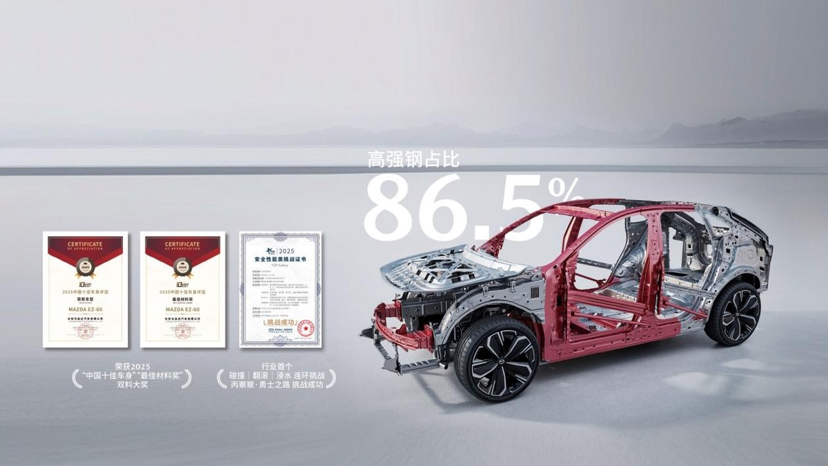 此外,EZ-60还斩获了“2025十佳车身”与“最佳材料”双奖。“中国十佳车身”评选是车身技术领域最高荣誉,长安马自达与宝钢合作,EZ-60的钢材可追溯,车顶横梁采用双方联合开发的1470MPa世界最高强度冷冲压件。整车7横5纵笼式铠甲车身中,86.5%为高强钢,27.45%是热成型钢,最高强度达2000MPa,超1500MPa超高强度零件集群多达50个。