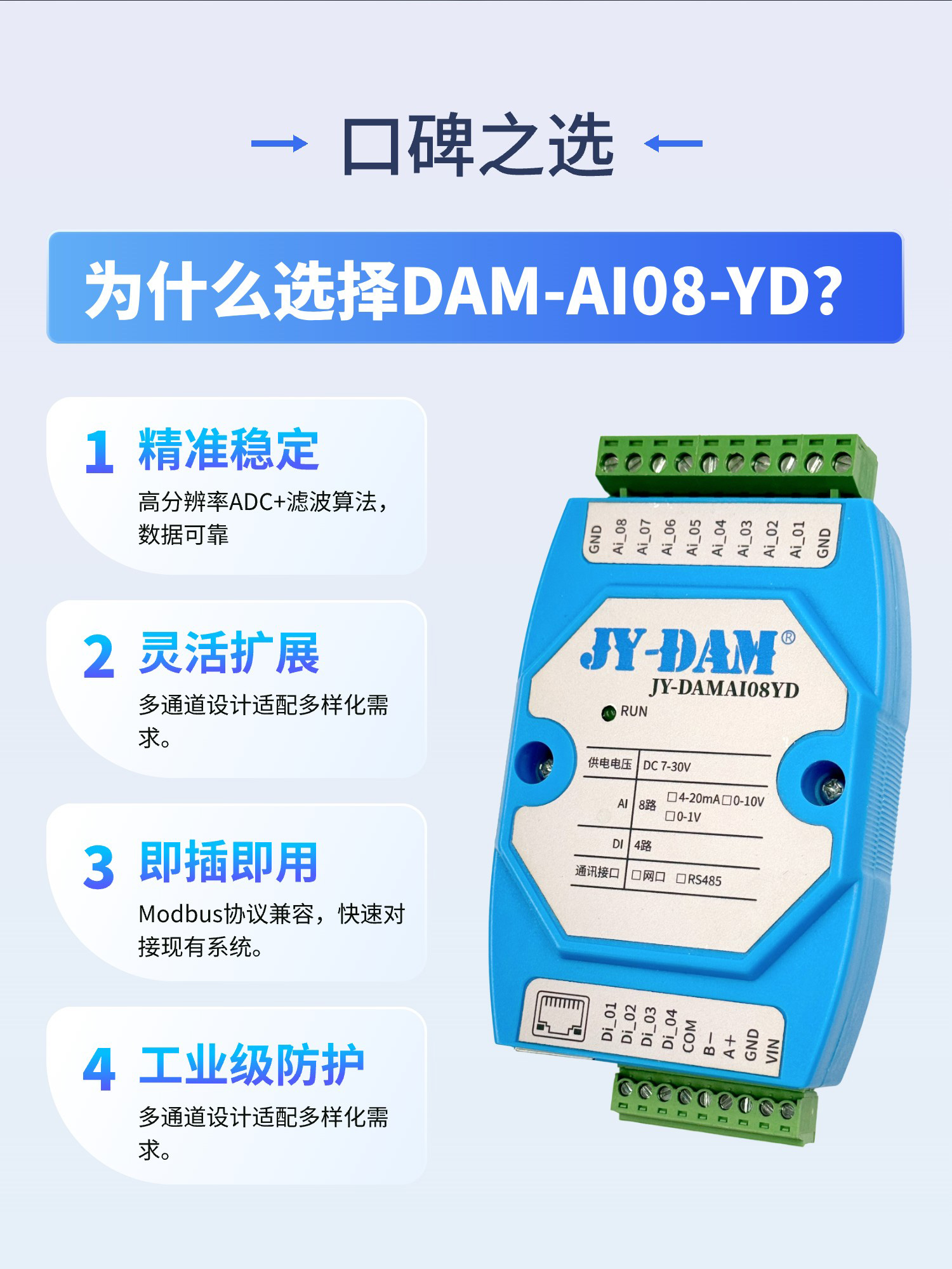 16位AD高精度模拟量采集模块在环境监测领域,是将物理环境参数转化为精准数字资产的核心设备。其高分辨率、多通道适配、工业级稳定性的特点,完美契合大气、水质、土壤、室内空气、气象等多场景的监测需求,不仅能满足国标级监测精度要求,还能降低部署与运维成本,为环保监管、生态保护、智慧农业等领域提供可靠的数据支撑——是环境监测从定性描述走向定量分析的关键技术组件。