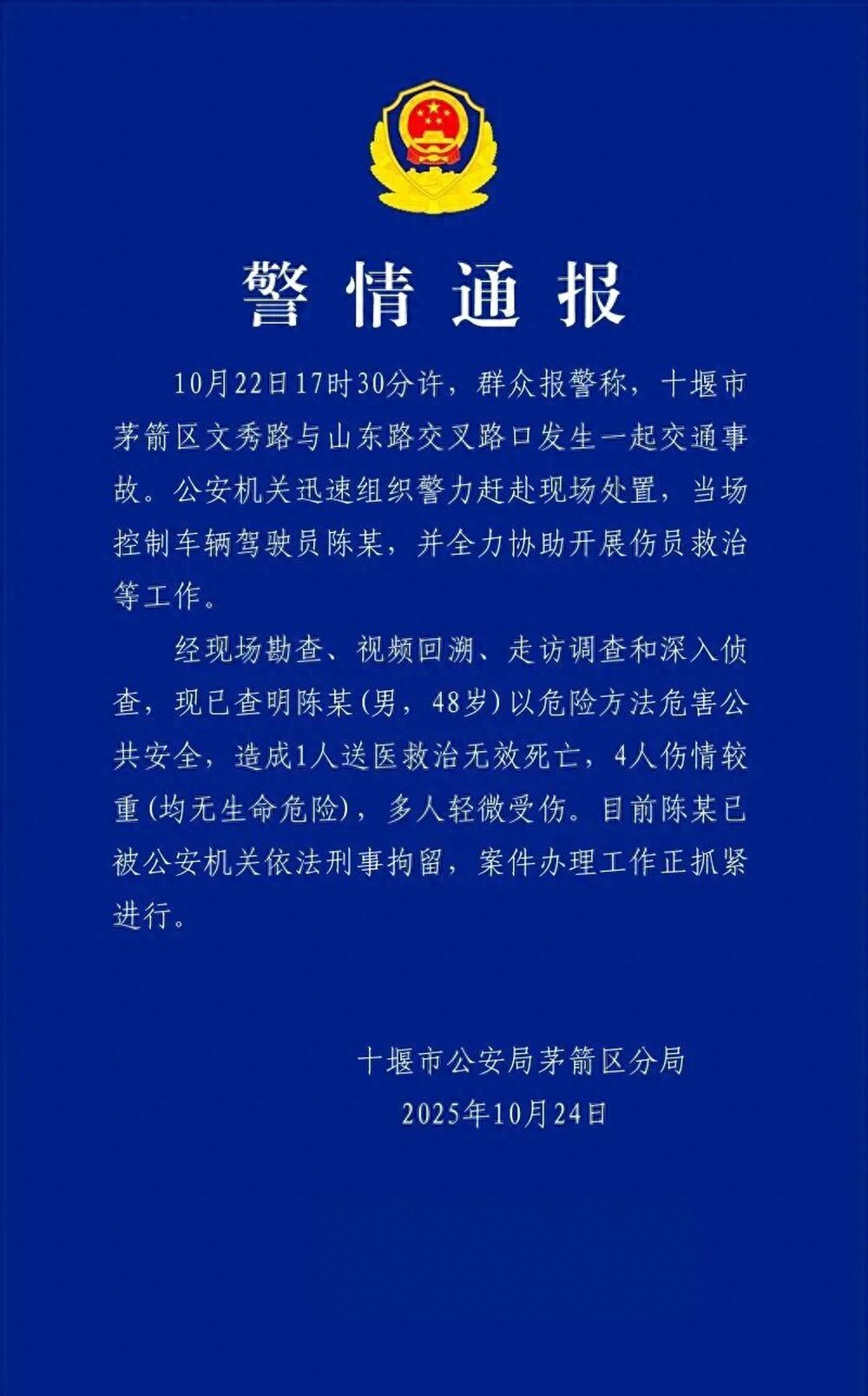 事发一分钟后警察就到了,驾驶员陈某当场被按住,医护人员抬着担架往车上跑。可接下来两天,大家的心一直悬着:到底伤了多少人?开车的为啥要撞人?教育局只说领导去了现场,警方也只说在调查,啥具体消息都没有。直到 24 号,茅箭区分局的通报才出来:48 岁的陈某是故意的,已经按 “以危险方法危害公共安全罪” 刑拘,1 个人没救回来,4 个重伤的保住了命,还有好些人擦破了皮。