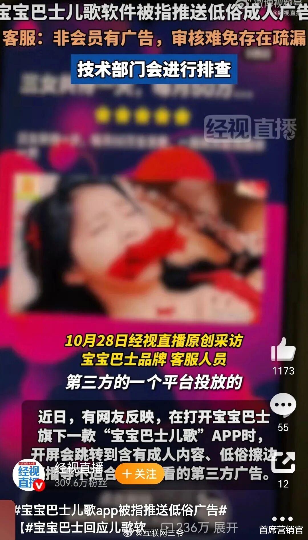 近日,有网友反映打开宝宝巴士旗下一款“宝宝巴士儿歌”APP时,屏幕上正跳转着“三女共侍一夫”的露骨直播封面,衣着暴露的主播在镜头前扭动,让自己和孩子十分尴尬。