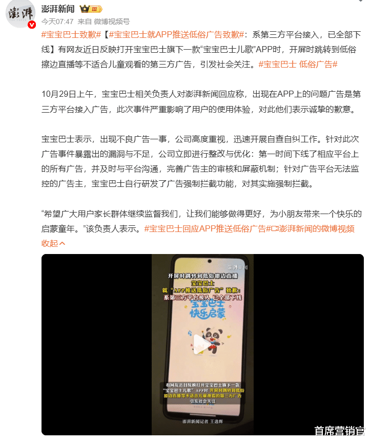 直到这一次“暴雷”,宝宝巴士似乎在广告植入盈利这条路上跑的更远了,10月29日上午,宝宝巴士相关负责人表示出现在APP上的问题广告是第三方平台接入广告,此次事件严重影响了用户的使用体验,对此他们表示诚挚的歉意。