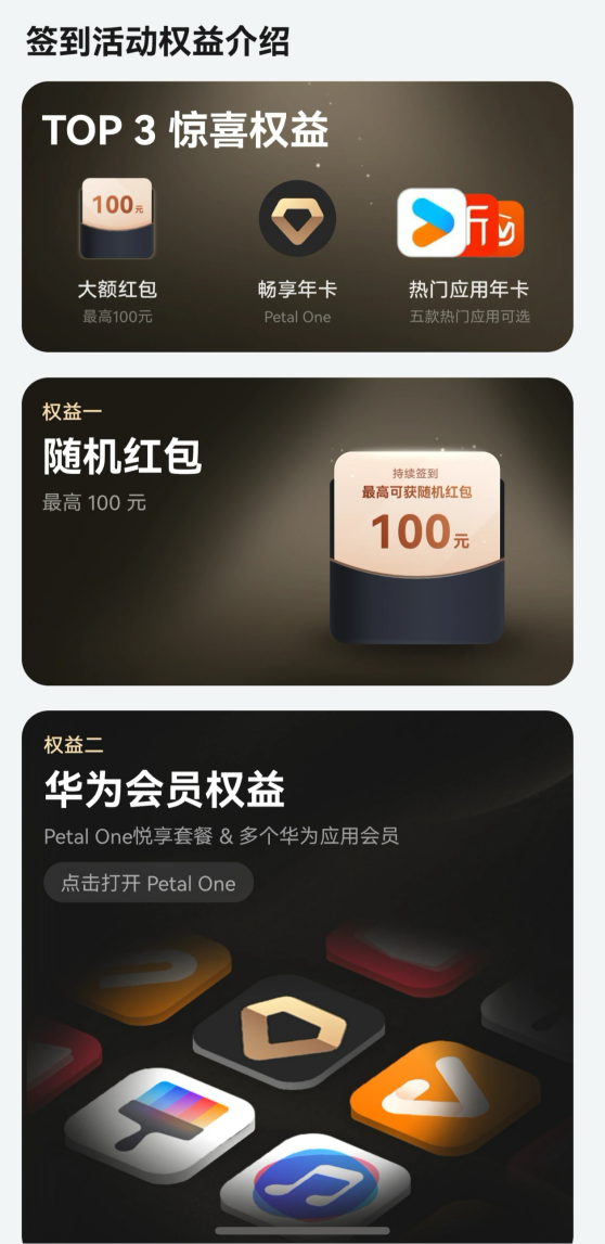 另外,在桌面右滑进入“负一屏”,还可以找到“鸿蒙有礼”活动入口,登录华为账号就能参加活动。每天签到有机会拿现金红包,还有各种会员权益。最关键的是,有机会开出华为音乐超钻会员,用白嫖会员来听这么“立体”的非遗音乐,这羊毛必须薅!