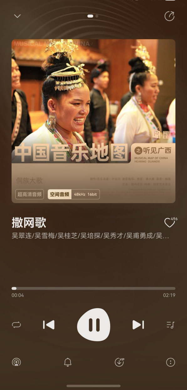 在这里还要称赞下华为音乐的“空间音频”功能,我随机点开一首侗族大歌,打开了“空间音频”,声音一出来,真的惊艳到了。
