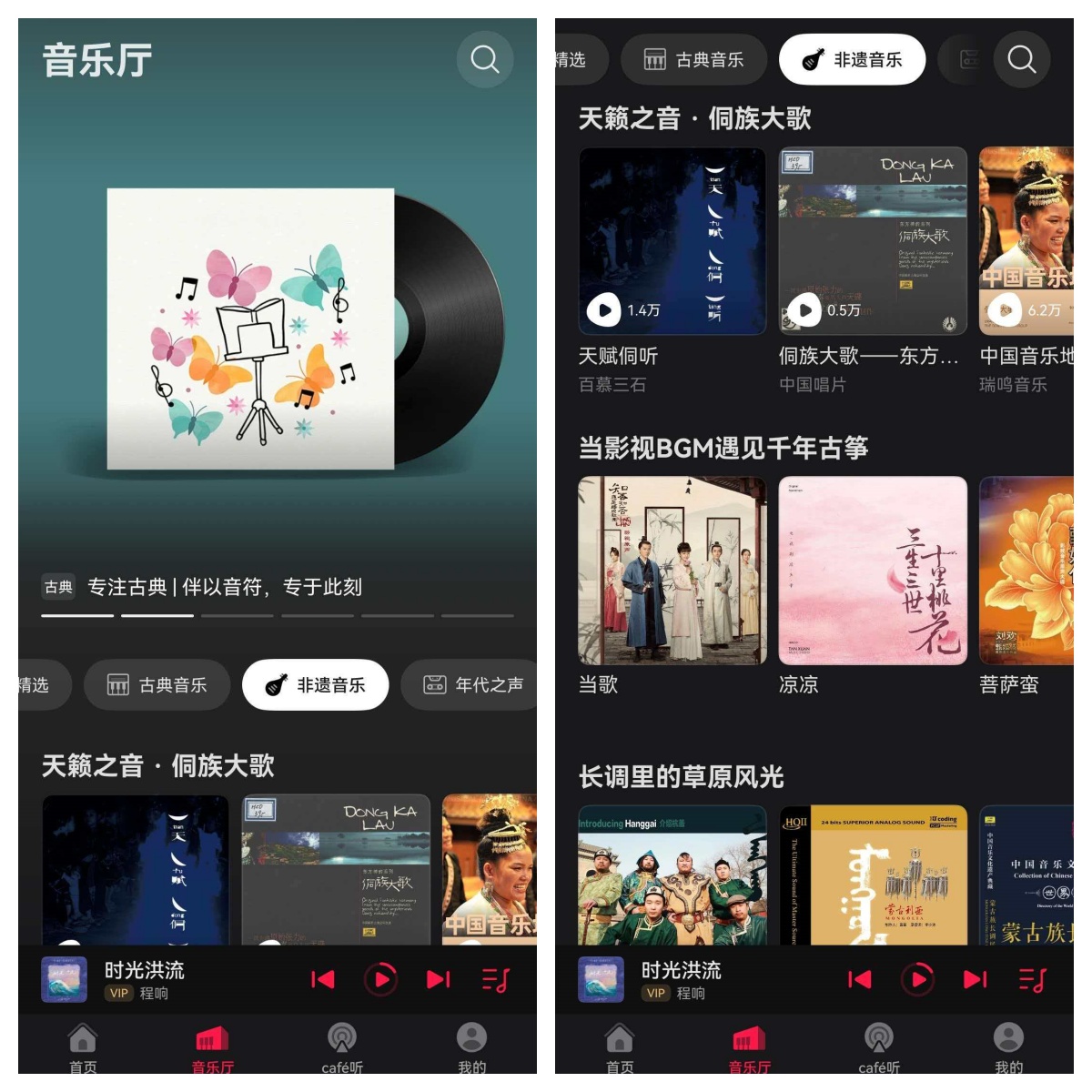 在华为音乐App主页点击“音乐厅”之后,就能看到“非遗音乐”的专区,包括了“天籁之音·侗族大歌”、“当影视BGM遇见千年古筝”、“长调里的草原风光”等多个专辑,每一个都带有浓浓的非遗元素,听音乐的同时能领略到各种截然不同的声音景观,感受那份质朴的生命力。