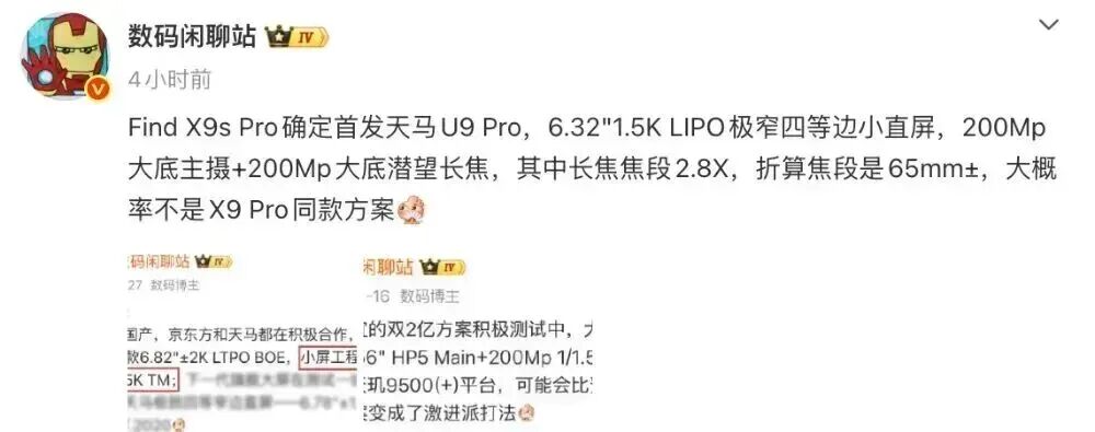 消息显示,Find X9s Pro首发天马U9 Pro,6.32"1.5K LIPO极窄四等边小直屏,200Mp大底主摄+200Mp大底潜望长焦,其中长焦焦段2.8X,折算焦段是65mm±,大概率不是X9 Pro同款方案。