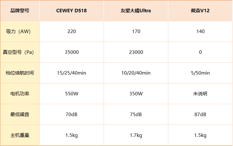 在日常使用体验方面的数据上看,CEWEY DS18 的主机重量仅有1.5kg,搭配70dB的低噪表现,兼顾轻量与静音,长时间使用也不易疲劳。其配备多种类刷头,能覆盖地面、布艺、床褥、缝隙等多场景清洁需求。友望大橘Ultra机身相对重些,噪音控制还行,但不突出。戴森V12主机同样为1.5kg,但噪音偏高。整体而言,CEWEY在舒适度、静音与刷头适配性上更均衡,尤其适合注重手感与操作体验的家庭用户。