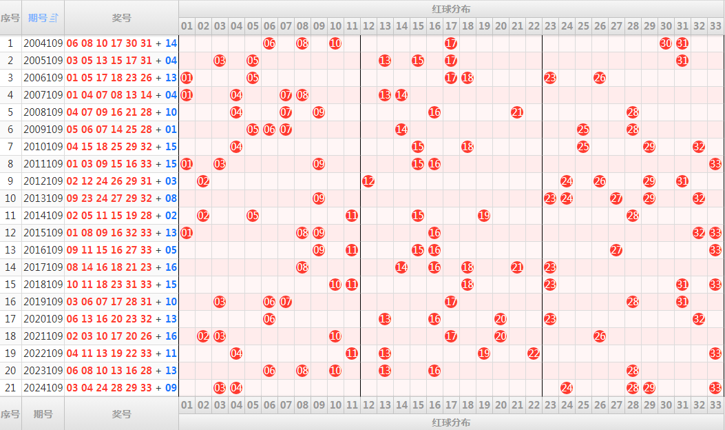 六、历史同期,红球开奖号码和走势图(历史数据演示):
