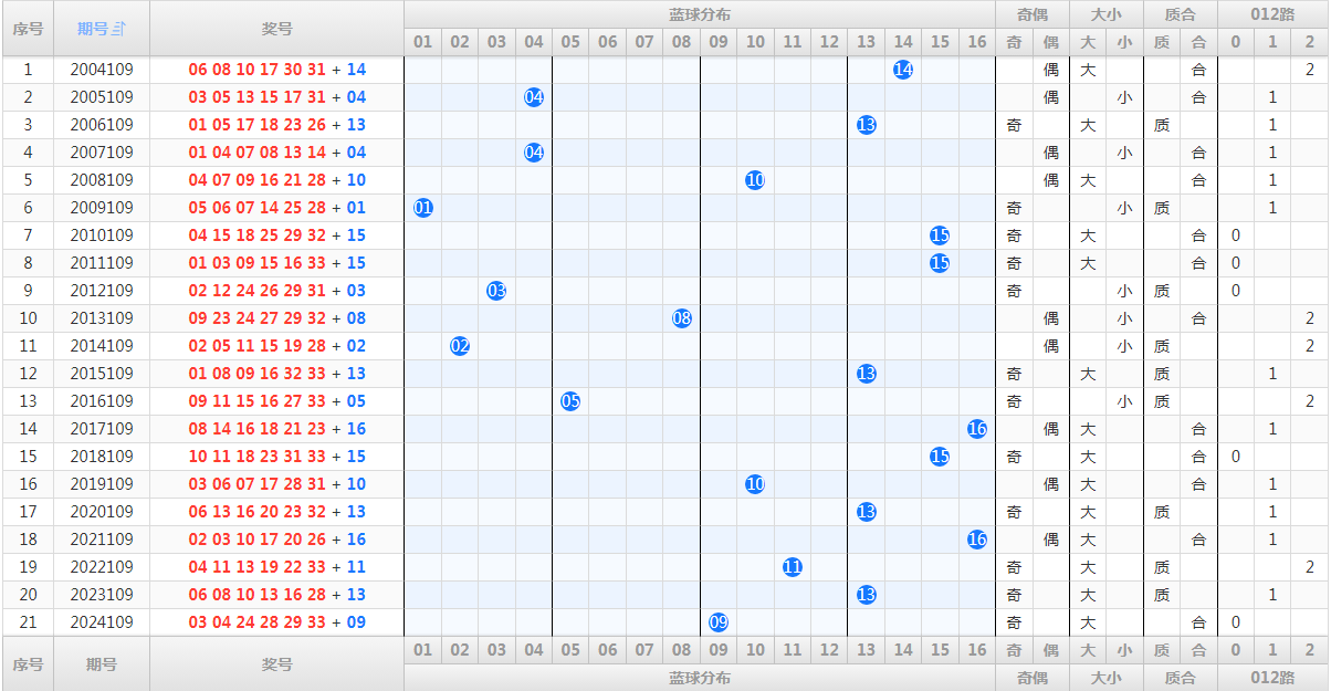 七、历史同期,蓝球开奖号码和走势图(历史数据演示):