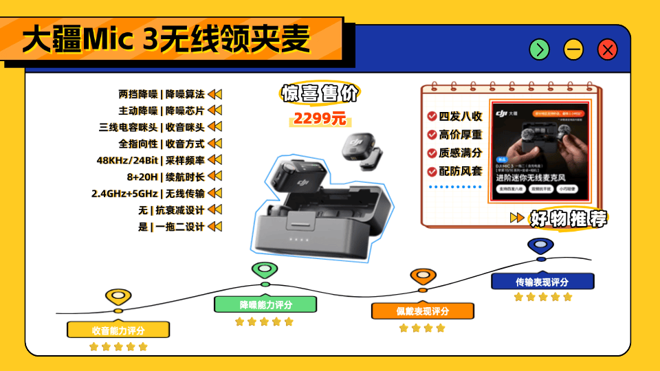 而无线领夹麦克风的佩戴体验与使用稳定性,主要受机身重量和传输技术影响:选轻量化材质的机型更便携,厚重机身会增加佩戴负担;采用双频段跳频或AI降噪技术的机型稳定性更强,单一频段或基础降噪则易受干扰。