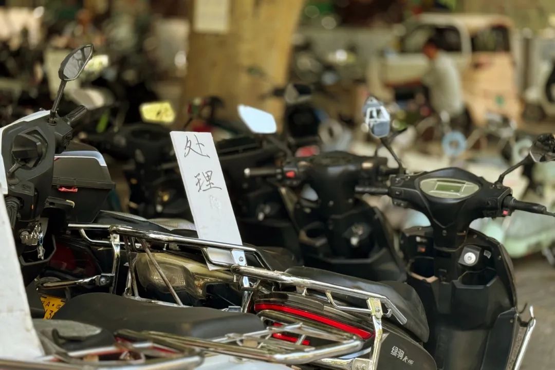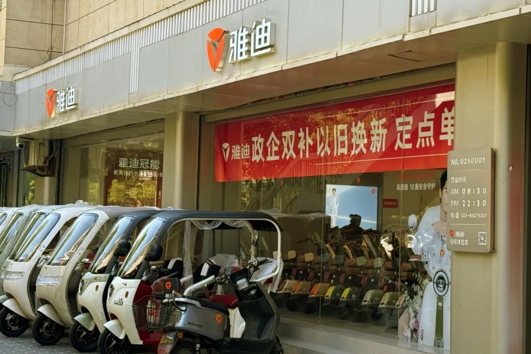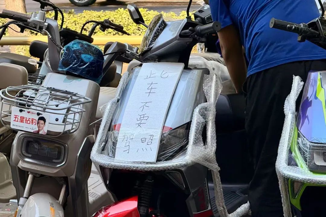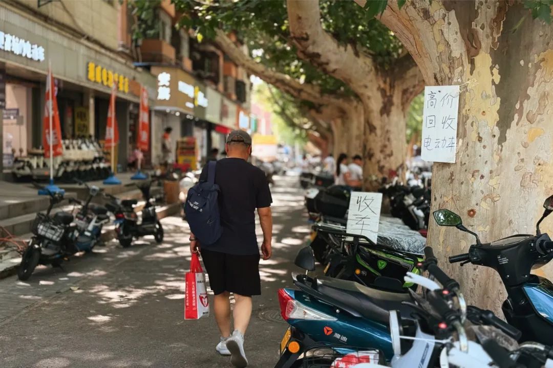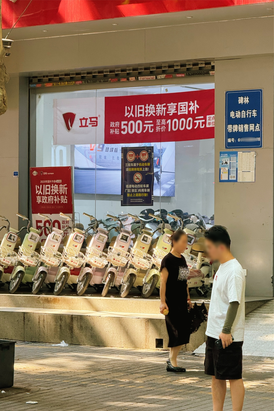 目前,伞塔路大部分店铺都是电自和电摩混卖的状态,各家各户打出来的标语也能看到“以旧换新”“国补”等字样。