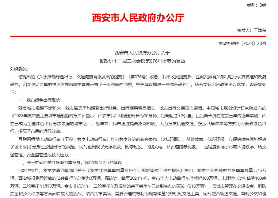 根据西安市人民政府办公厅关于省政协十三届二次会议第676号提案的复函,截至2024年初,全市个人电动自行车挂牌近400万辆,未挂牌电动车估算100余万辆,二轮摩托车近70万辆。全市非机动车、二轮摩托车及投放的共享类单车已达到空前的高位(618万辆)。