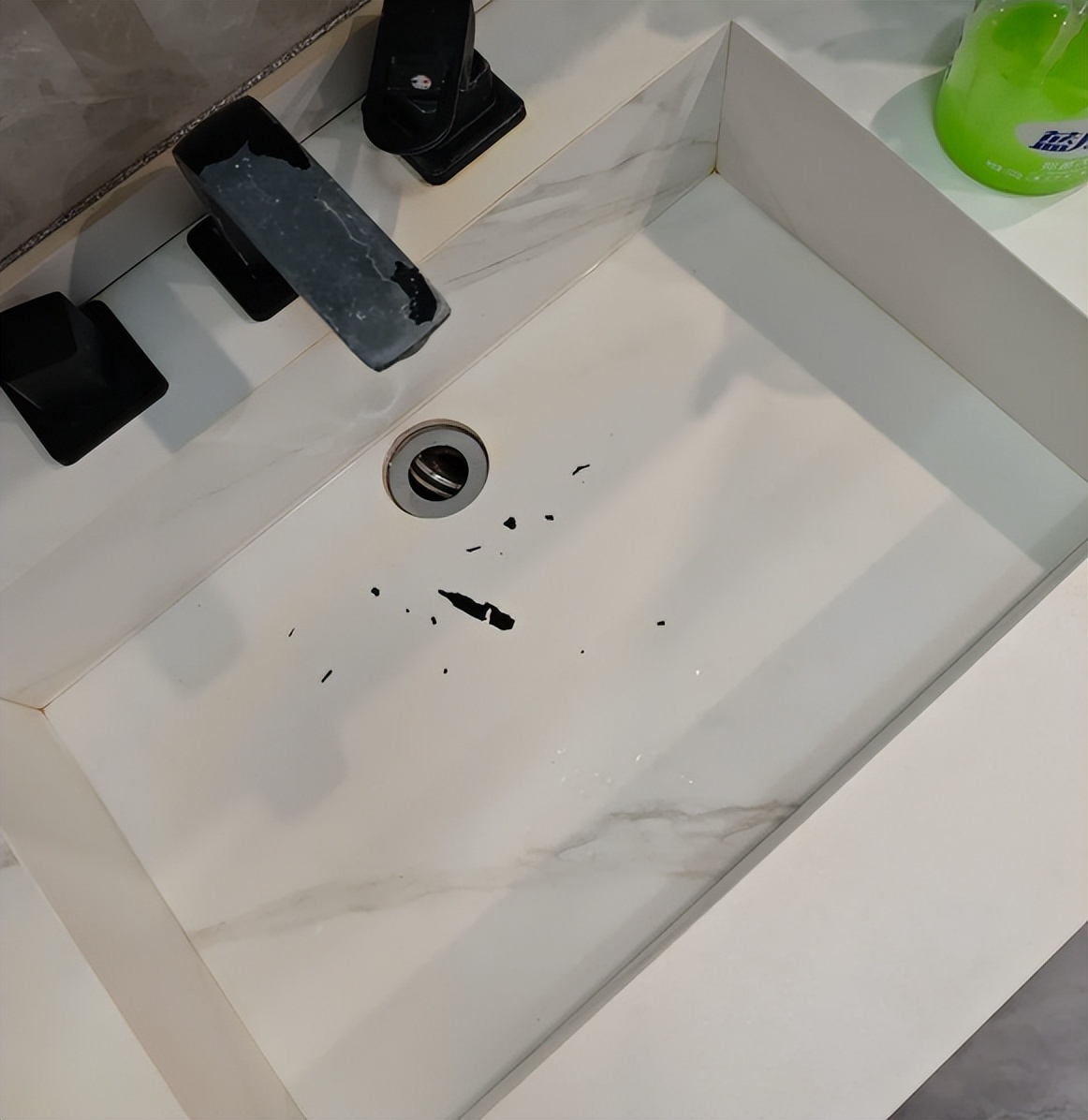 我家当时也是做了这种直角岩板洗脸池,不仅藏污纳垢,放重物台盆底下还容易脱落,现在想想,当时还不如老老实实做普通的陶瓷一体盆呢!