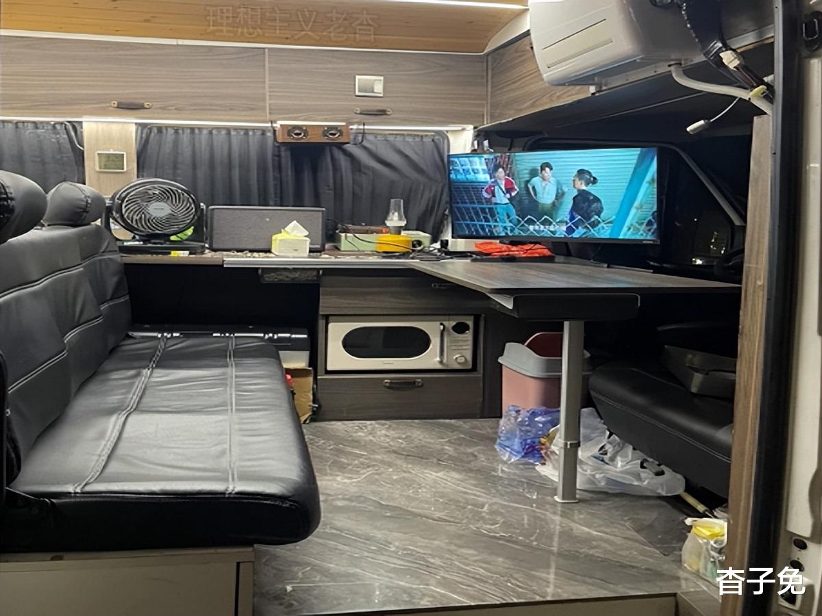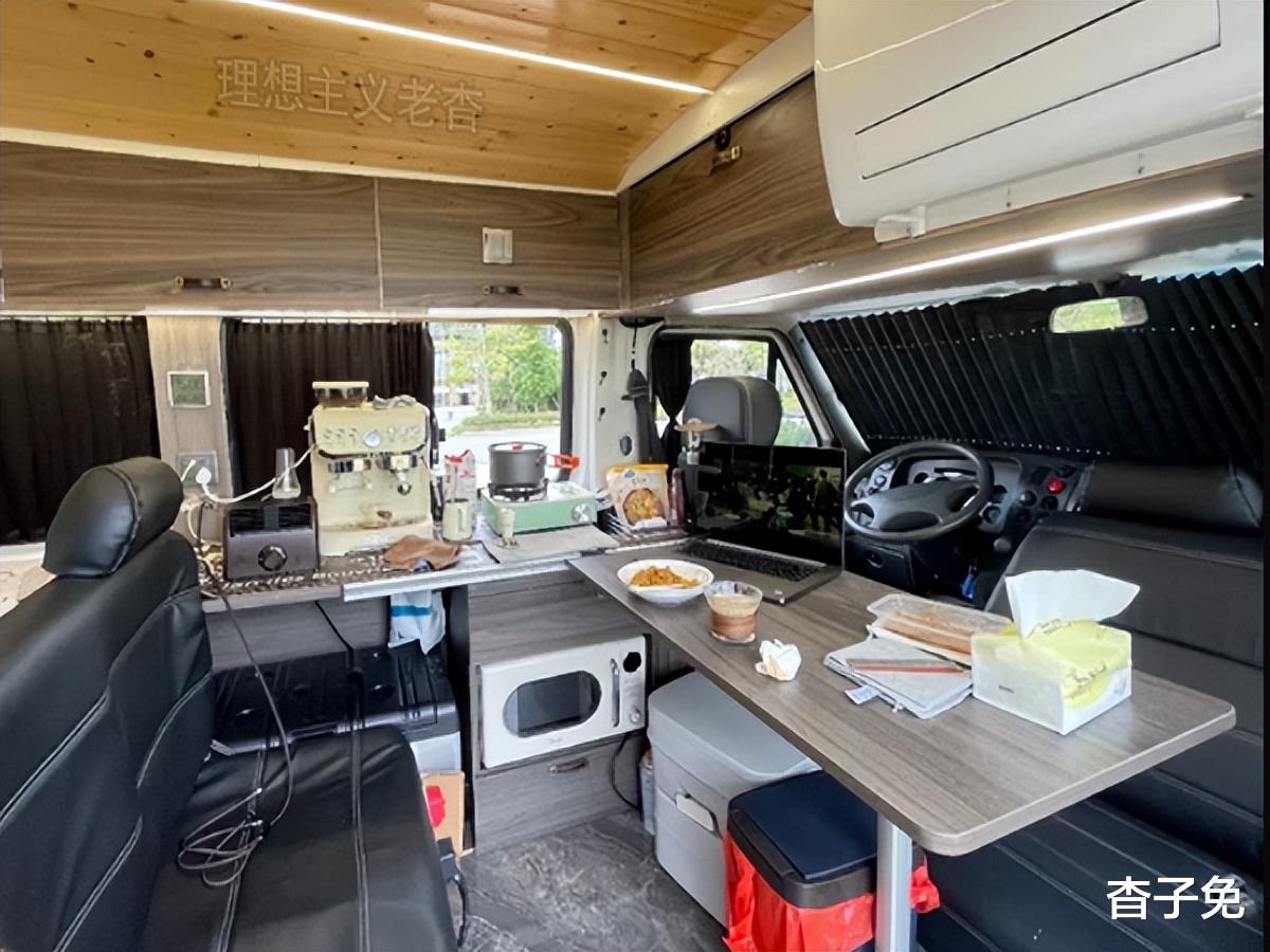 侧柜上下有常用炊具,打开左中窗,就可在室内烧水做饭,办公桌也秒变小餐桌,副驾双人位座椅向后翻转,就是移动微客厅,上部还吊挂有驻车空调开启后更舒适。