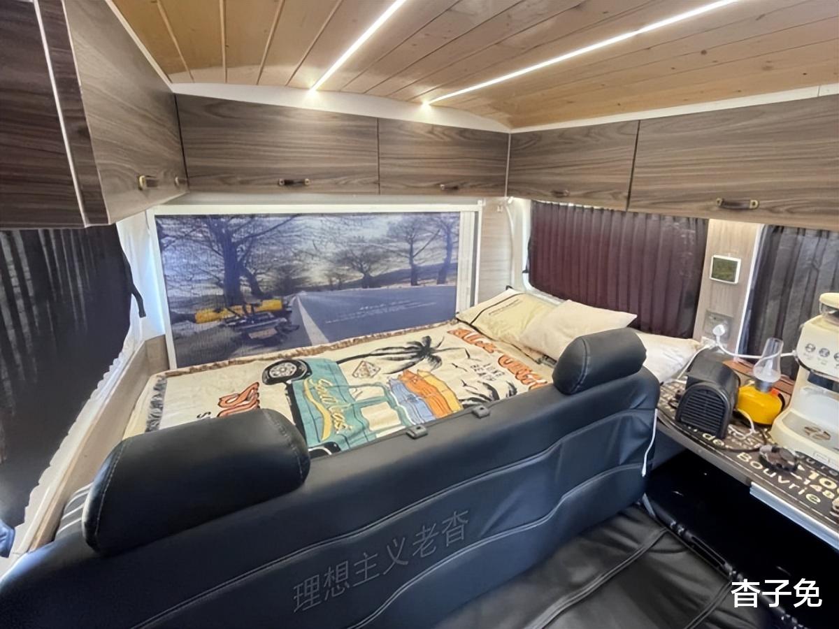 车后是一张横向双人床,睡床已经铺好,上部吊柜可放衣服被褥等物品,打造车载小卧室,解决了旅途休息问题。