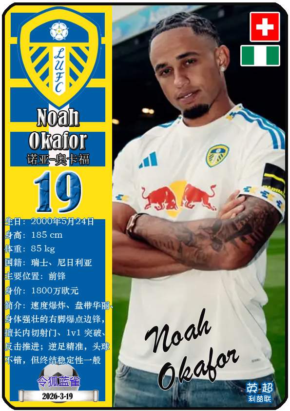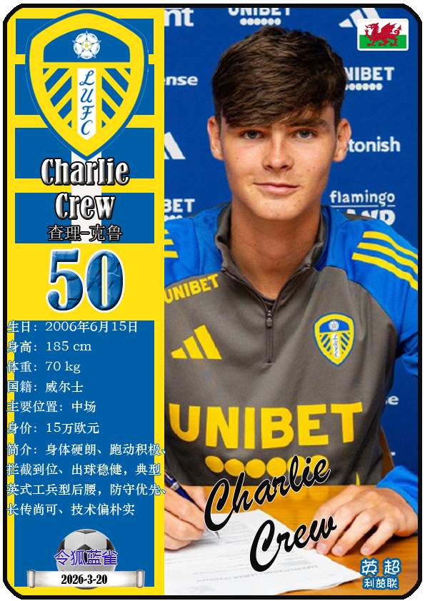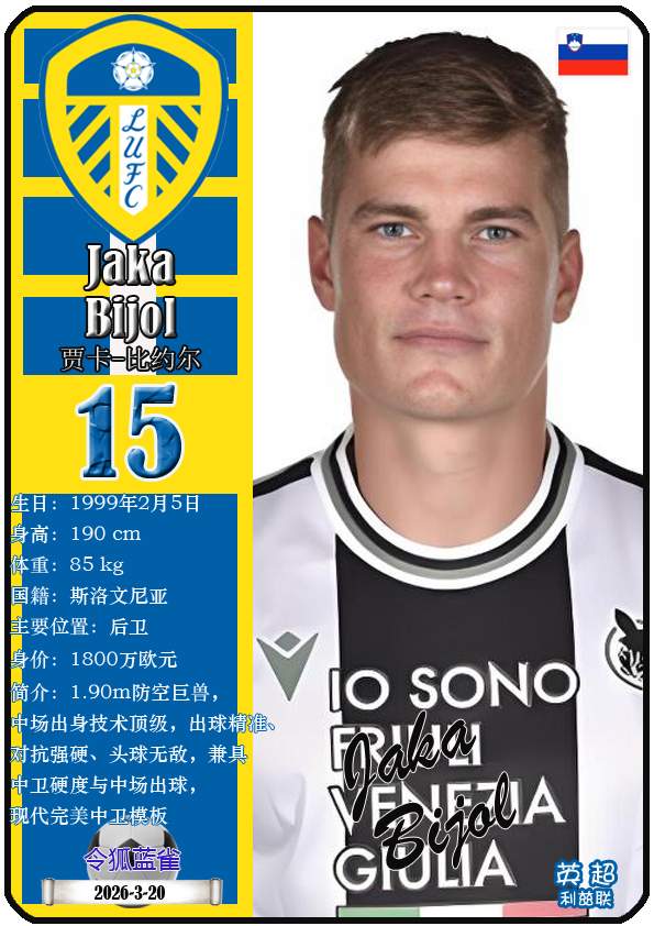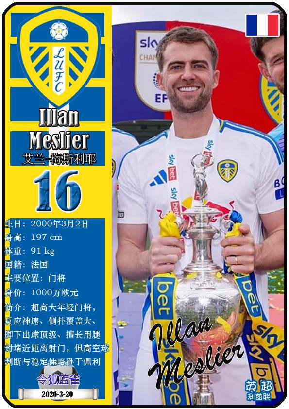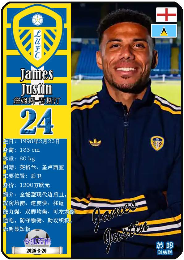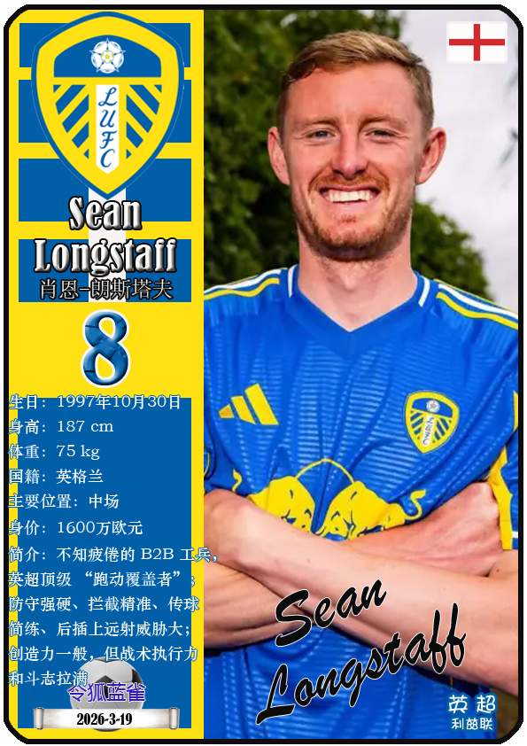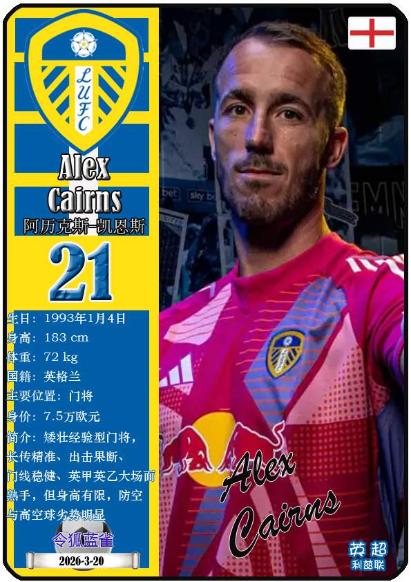 截至2026年3月20日,英超利兹联足球俱乐部主教练是丹尼尔·法尔克,队内拥有球员乔尔-皮罗、多米尼克-卡尔维特-勒温、丹尼尔-詹姆斯等。本期以球星卡的形式展示目前英超利兹联足球俱乐部的26名球员(按球衣号码排序):