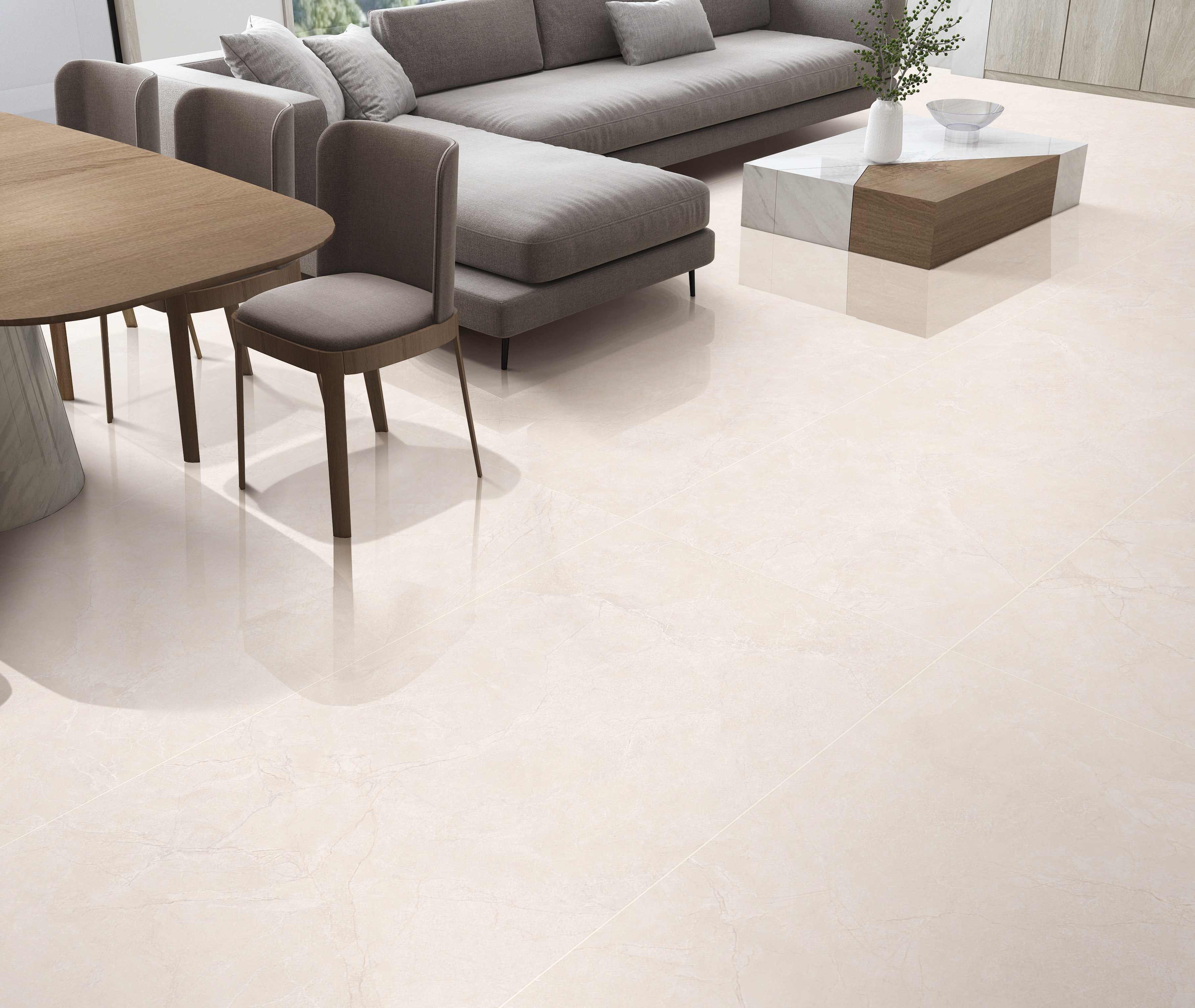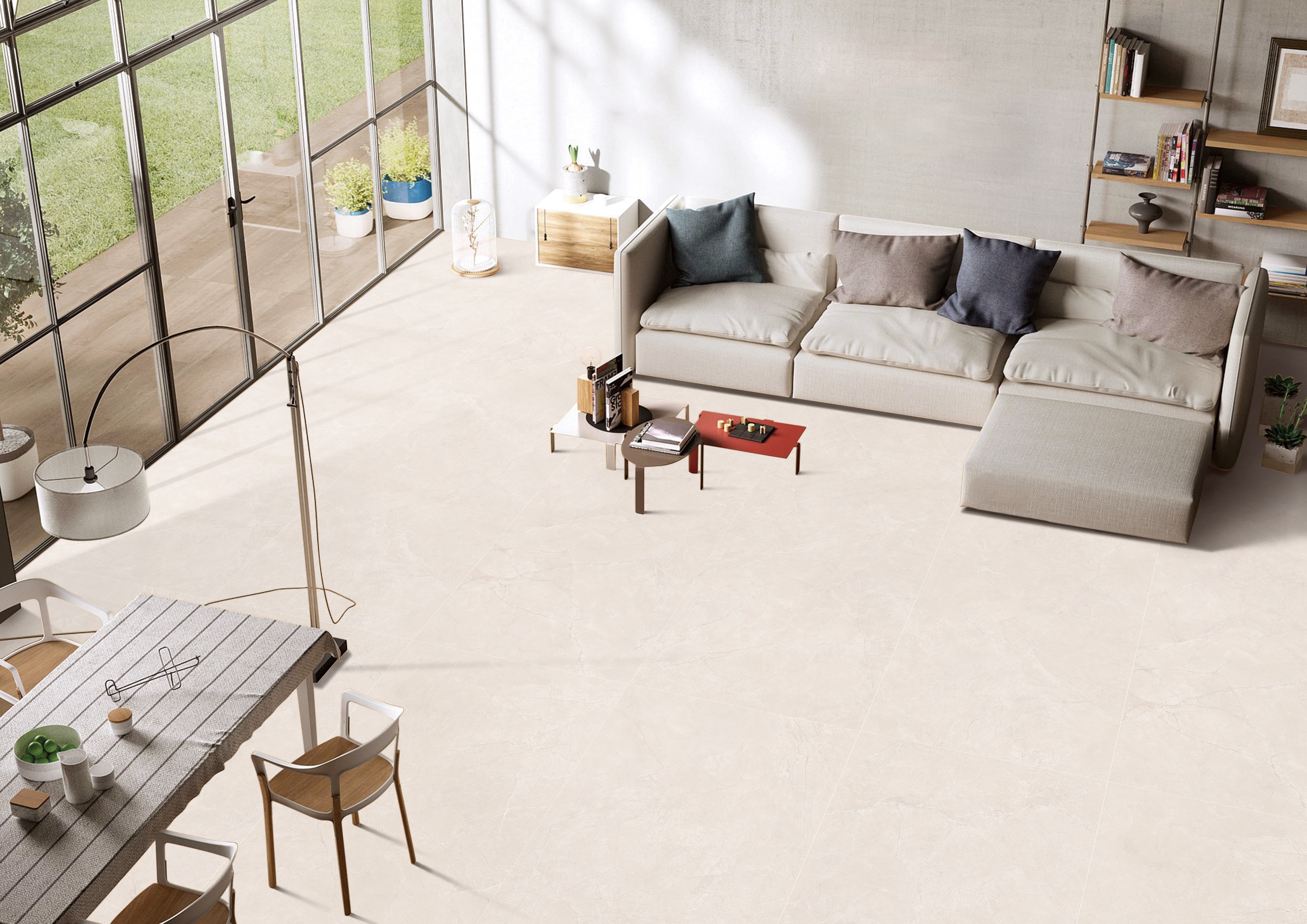 客厅里,国际瓷砖品牌罗曼缔克卡拉其浅色瓷砖如晨曦铺地,搭配浅灰布艺沙发与木质家具,阳光透过落地窗洒下,纹理细腻的瓷砖让空间更显通透温馨,每一次落脚都似踩在云朵上。