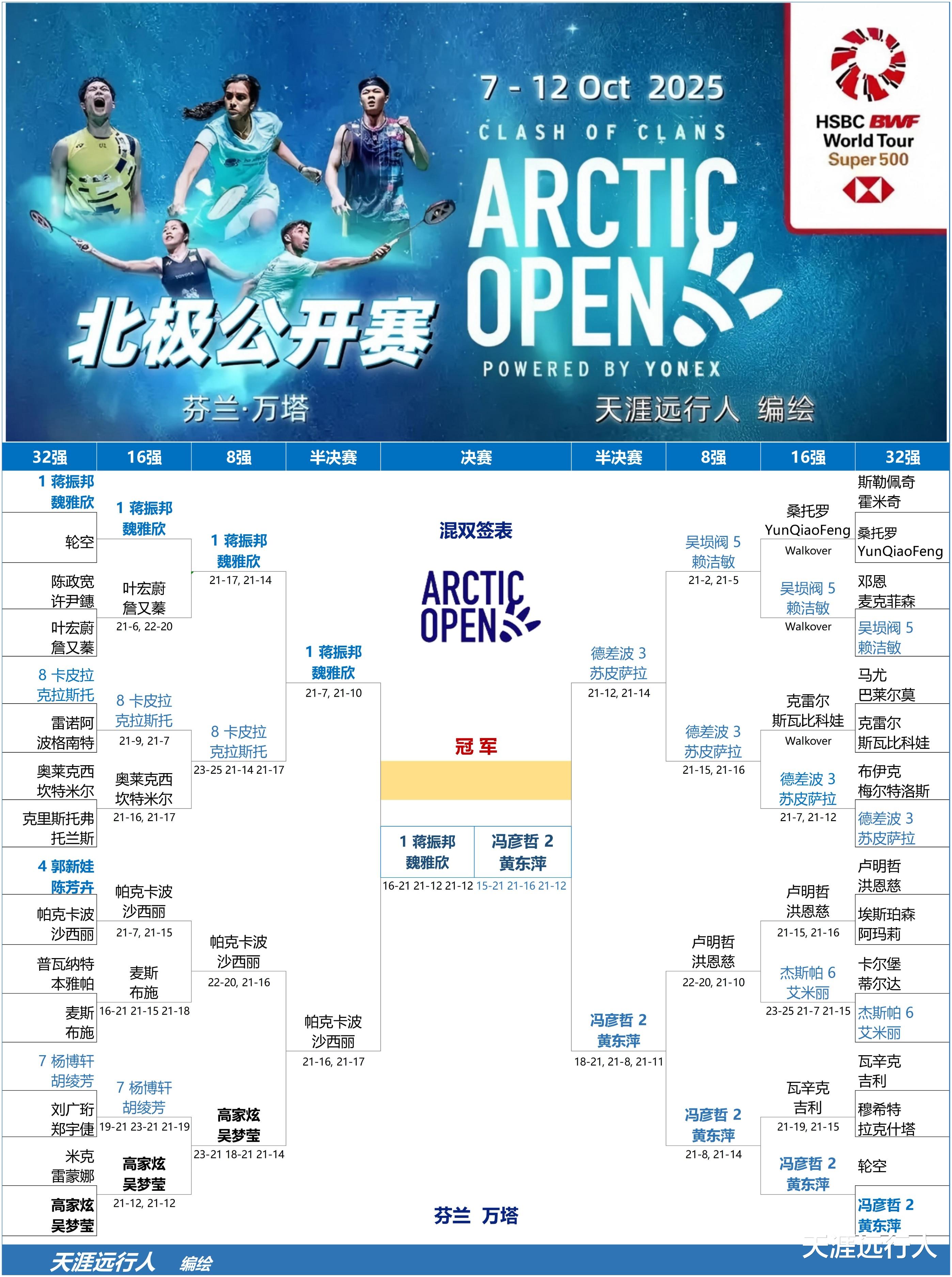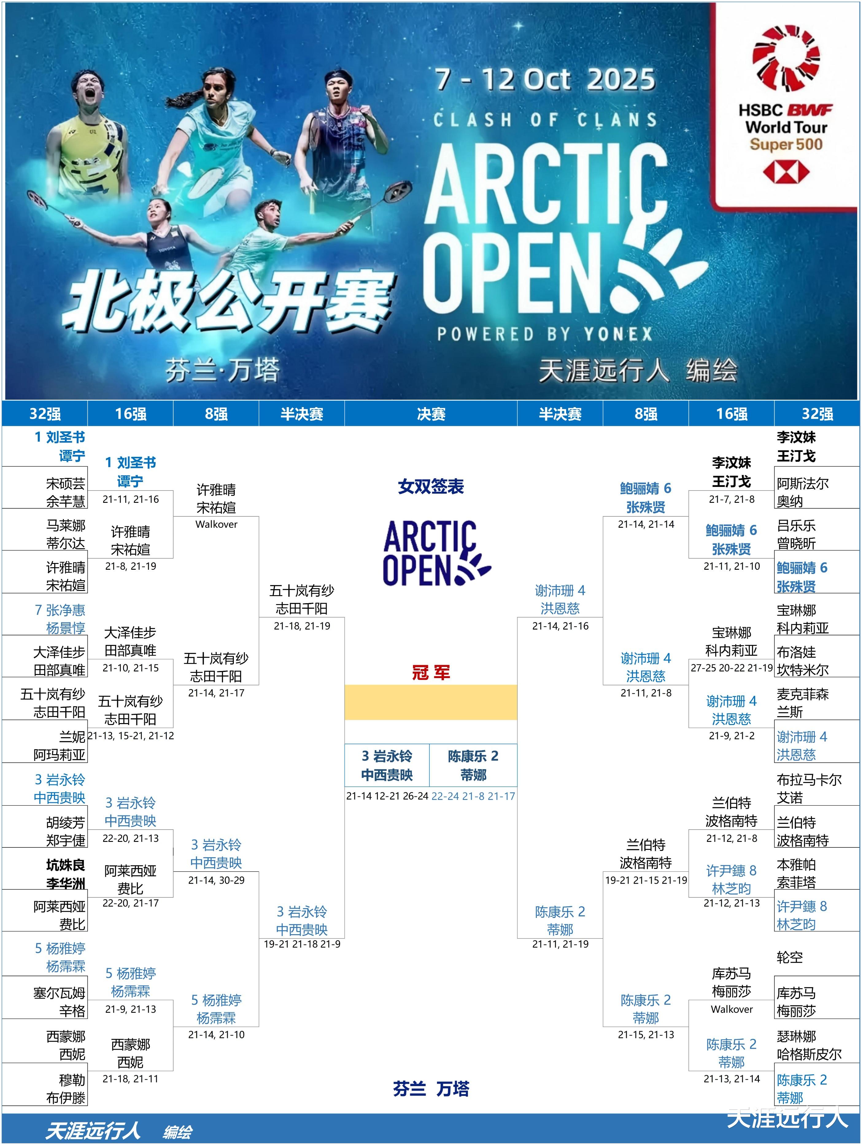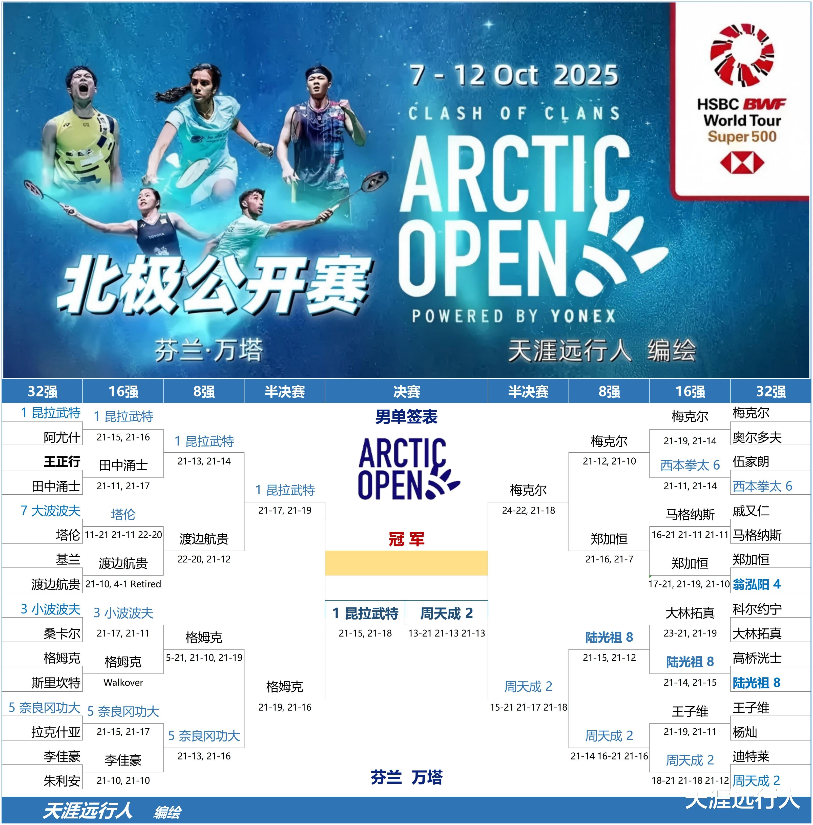 北京时间10月12日凌晨0时48分,2025世界羽联超级500北极公开赛,五个单项半决赛的10场角逐,全部决出了胜负,决赛对阵出炉。