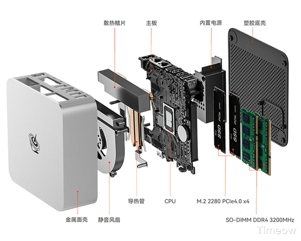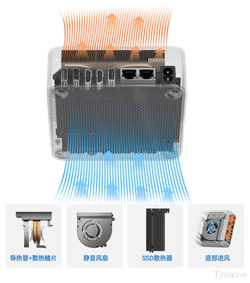 零刻EQi13 Pro现在用上了自研的MSC2.0热处理系统,通过高效率的导热管和散热鳍片将核心的热量快速摊开,接着,通过大尺寸的静音风扇再把热风排出去:
