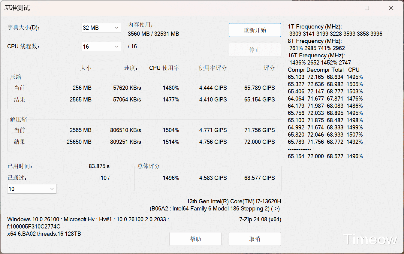 对于日常办公来说,7-ZIP基准测试代表了整机的生产力性能,成绩与CPU和内存性能强相关。
