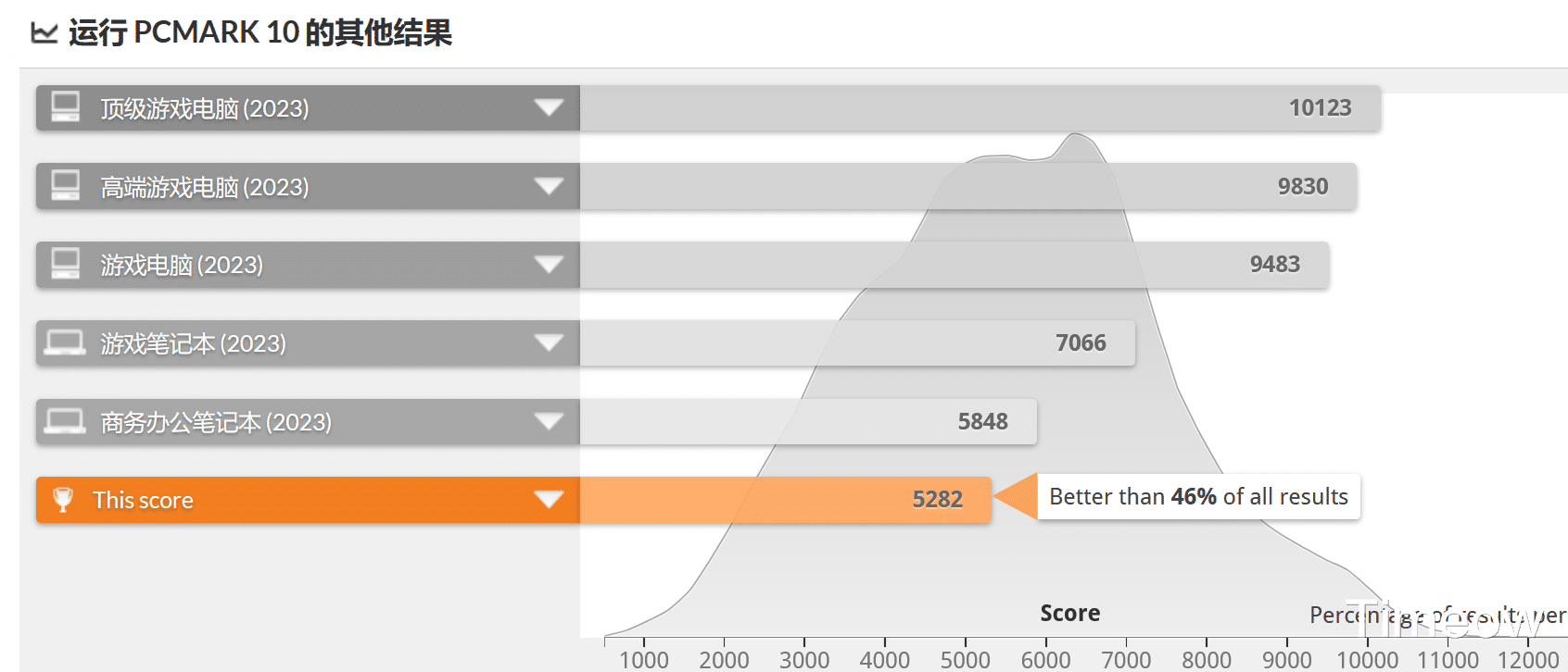 在PCMARK 10的在线结果评比中,对比其他参与测试的高性能电脑,这台迷你主机的得分好过46%的机型,与之相似的高端商务办公笔记本(i7-1360P处理器,售价6780港币)得分仅比它多了10%。
