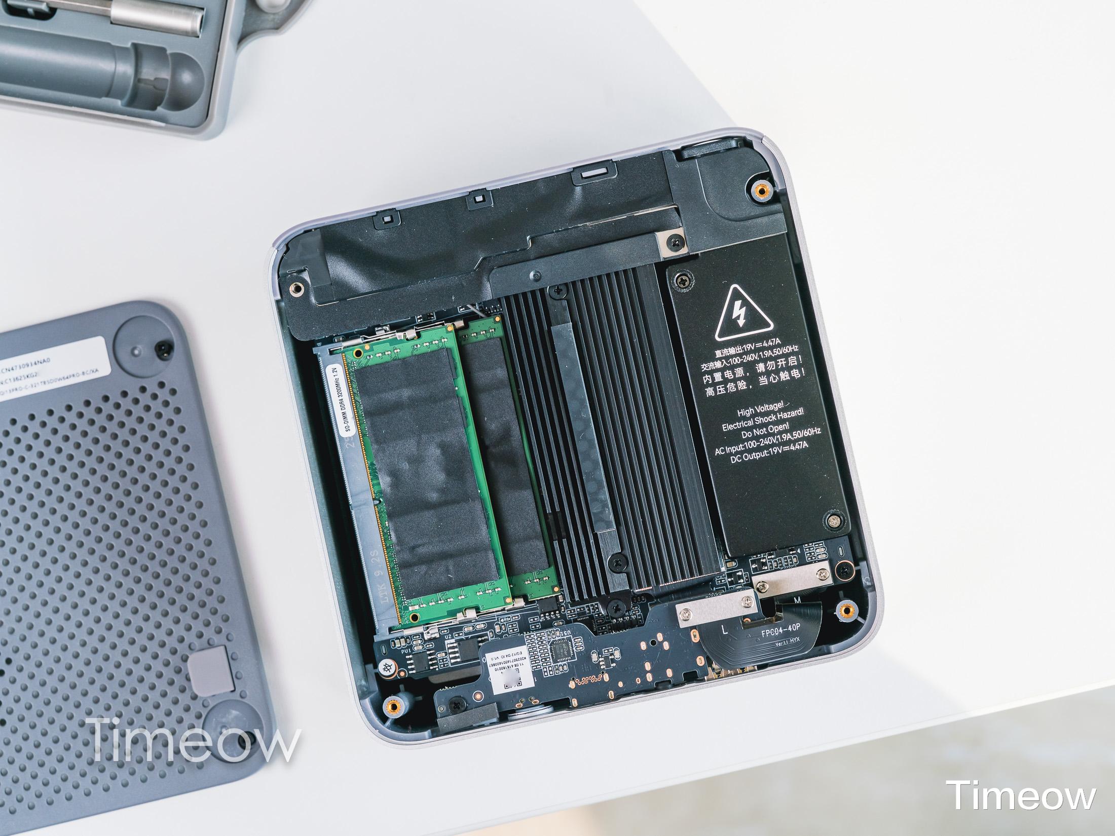 拆下底盖后,就可以看见内部结构了,可见部分包含内存、SSD散热器、内置电源、以及WiFi天线板。