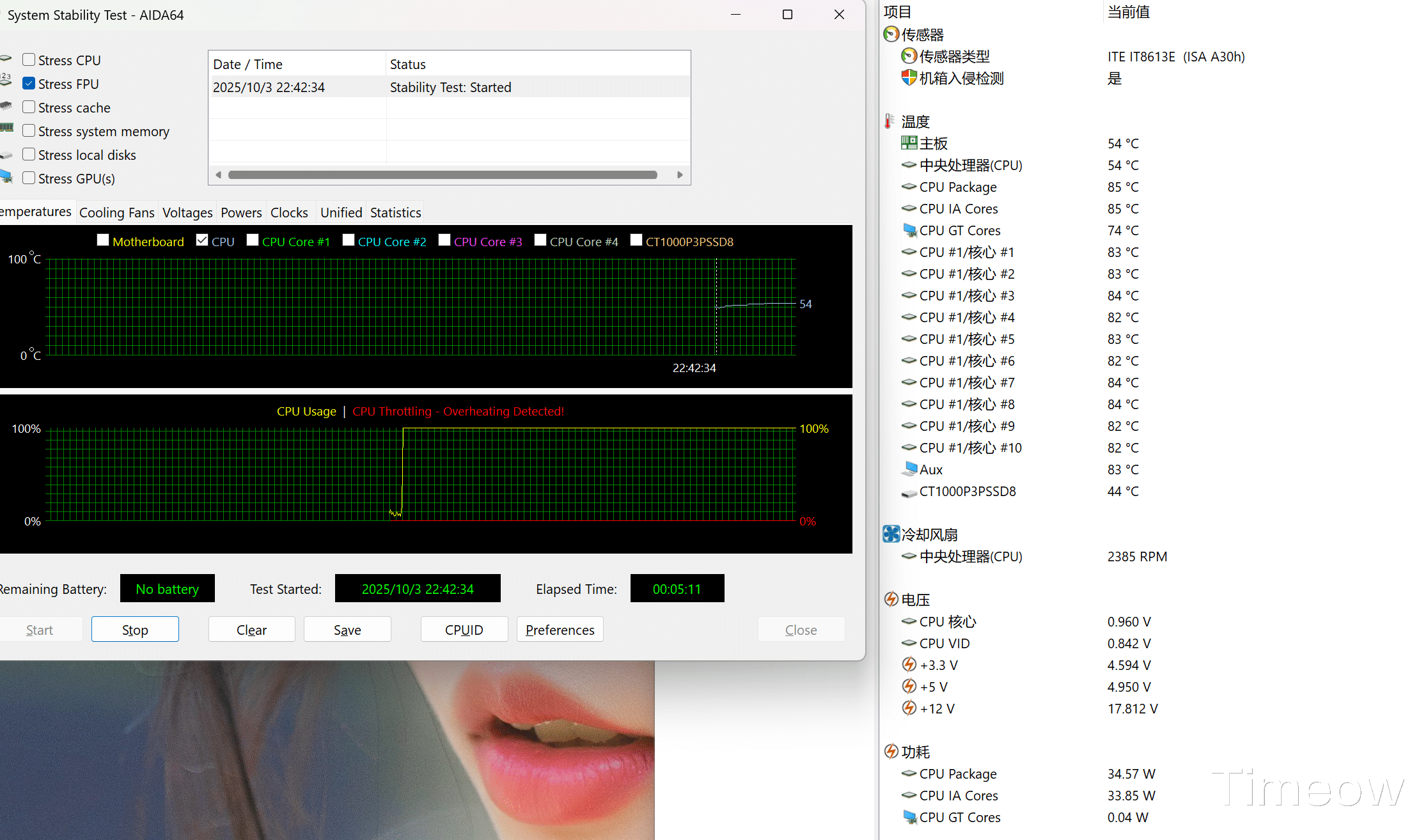 实测在AIDA烤机时,内部核心温度最高才85摄氏度,距离传统的95度高温墙还有很远的距离,而且CPU功率非常稳定,没有出现过热降频的问题(过热降频的红线一直都在最底下,保持着0%)。
