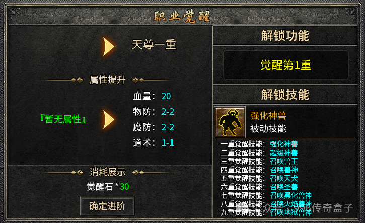 比奇矿区一层有尸王殿,每小时必刷二十只尸王,必爆觉醒石,但前期应该不好打,因为地图小,走位也不好施展。外面地图的BOSS也几率掉落觉醒石,血量越高爆率越高。觉醒石是职业觉醒的必备材料,职业每提升一重,不仅会增加属性,还会解锁被动技能,比如道士,觉醒技能可以强化神兽,九重觉醒技能直接召唤地狱兽神!