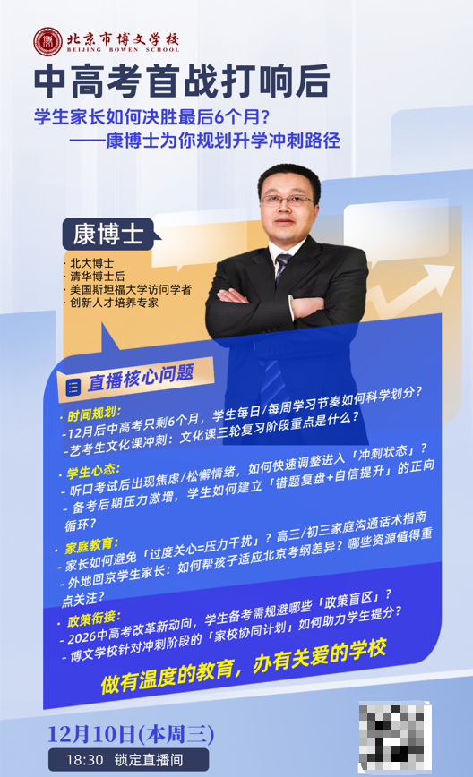 12月10日(周三)晚,博文学校首席专家康博士将带来「中高考冲刺规划专场」,从时间管理、心态调整、家庭教育三大维度,拆解学生&家长最关心的10+核心问题,更有「家校协同提分计划」独家披露!