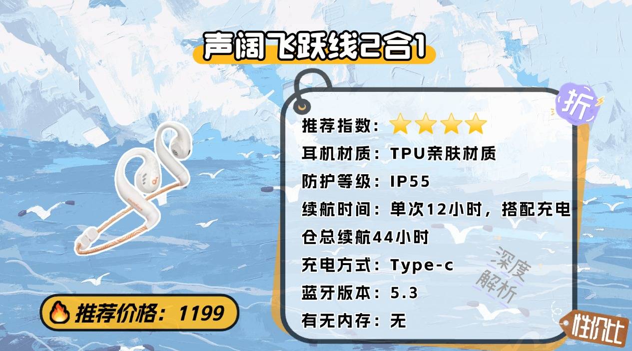 声阔飞跃线 2 合 1 是一款兼顾舒适与音质的开放式运动耳机,采用“气传导 + 骨传导”双模式设计,解决了传统骨传导耳机震动强、音质损失大的痛点。