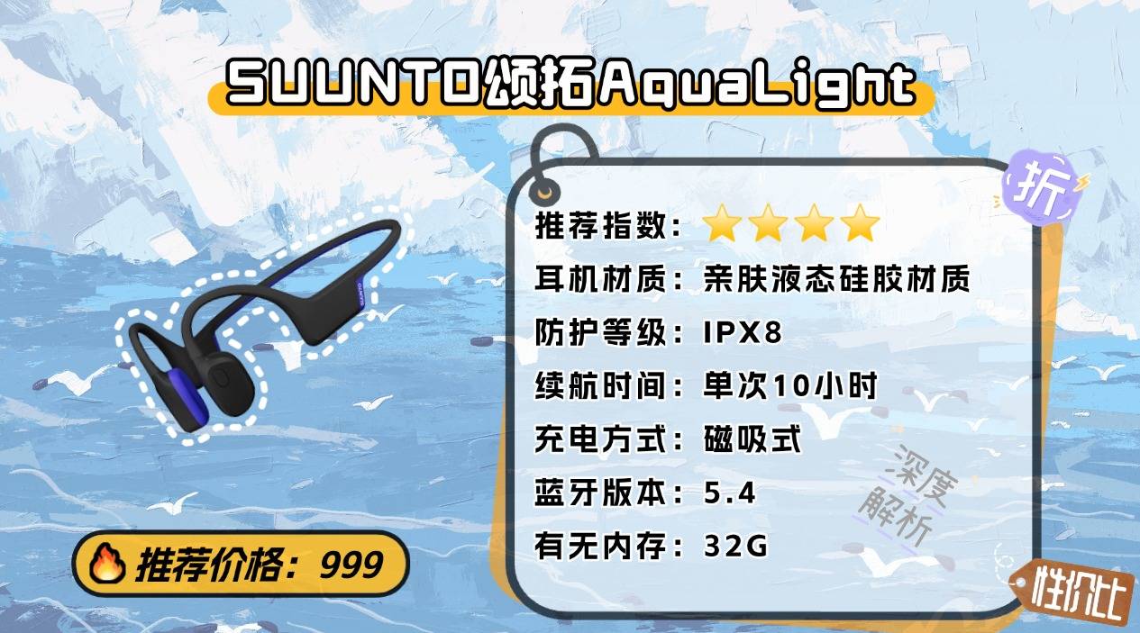 SUUNTO 颂拓 AquaLight 是一款专为游泳及户外运动打造的轻量化骨传导耳机,兼顾防水性能与舒适佩戴。