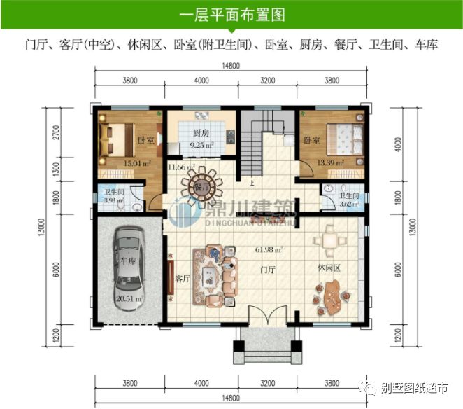 一 层:门厅、客厅(中空)、休闲区、卧室(附卫生间)、卧室、厨房、餐厅、卫生间、车库