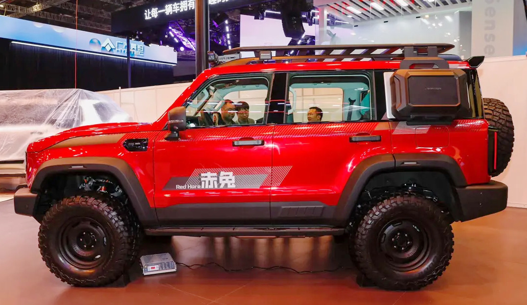 外观方面,BJ40增程赤兔版采用火焰红车漆和赤兔限定拉花,配备了越野风格的前保险杠,内部自带绞盘,两侧配备雾灯。车侧配备涉水喉,能够大幅提升涉水性能。新车的底盘相较普通版车型也有所提升,配合大尺寸的泥地轮胎,进一步提升通过性。车顶配备了行李架,前方有一排探照灯设计,此外车尾还配备了侧挂式的储物箱以及铝合金梯子。