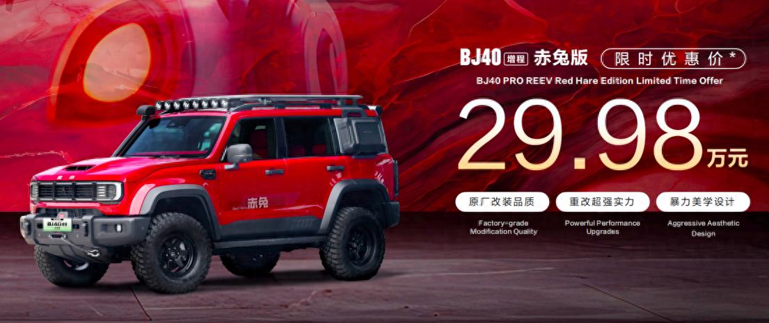 在2025上海国际车展上,北京越野BJ40增程赤兔版正式上市,新车限时优惠价29.98万元。BJ40增程赤兔版在颜值、性能、安全三大关键方面进行了全面且针对性的升级,并进行了越野套件改装,加装了绞盘与后拖车钩,改装提升项的总价值超20万元,为驾驶者带来了更为极致的越野体验。新车预计今年四季度正式交付。