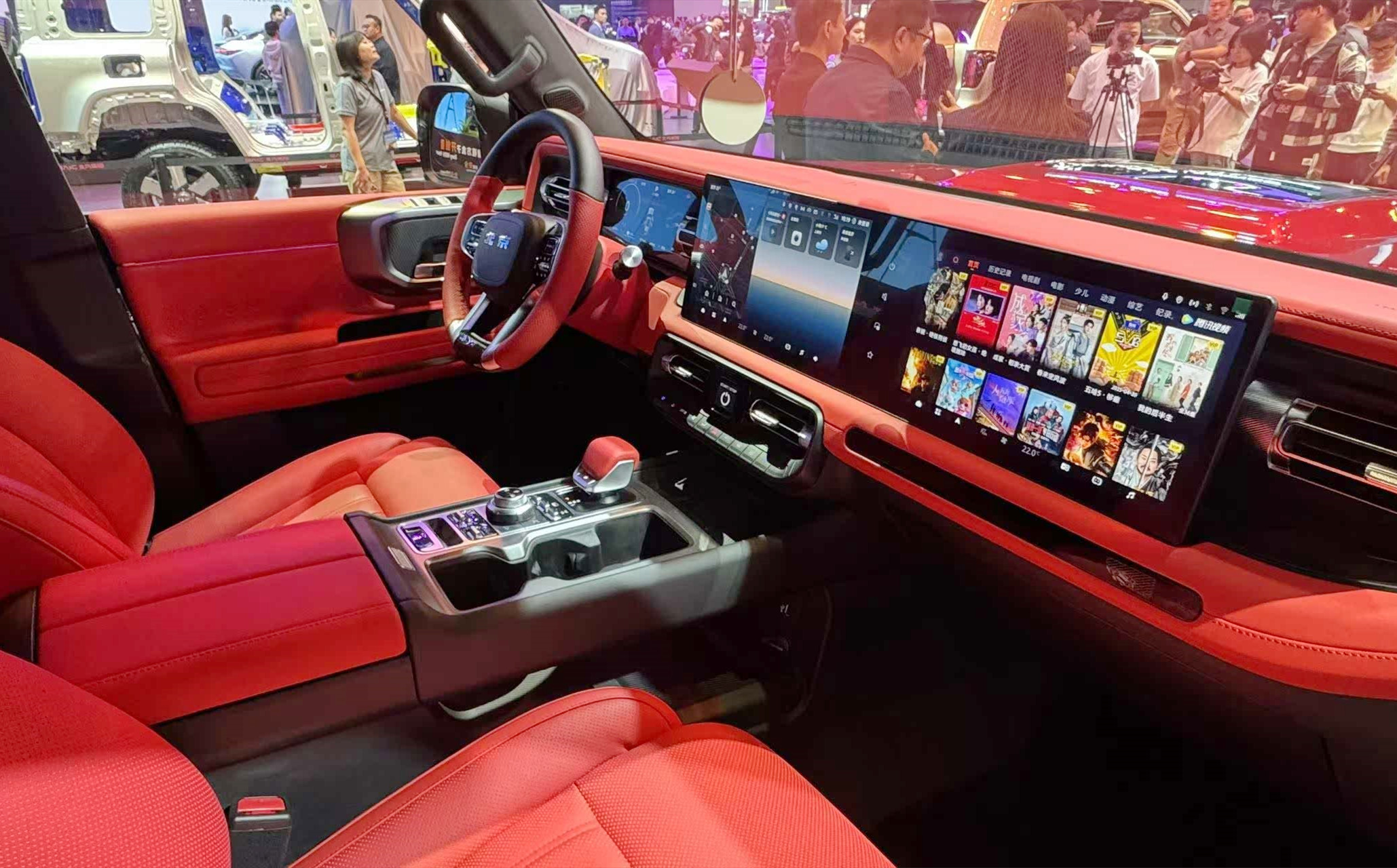 进入车内,记者发现新车内饰中控台与副驾采用双联屏的设计,全系标配10.25英寸液晶屏、12.8英寸中控屏、12.8英寸副驾屏、9英寸流媒体后视镜,车机配备高通骁龙8155芯片,支持AI语音情景式对话,新车提供10扬声器音响+独立功放。