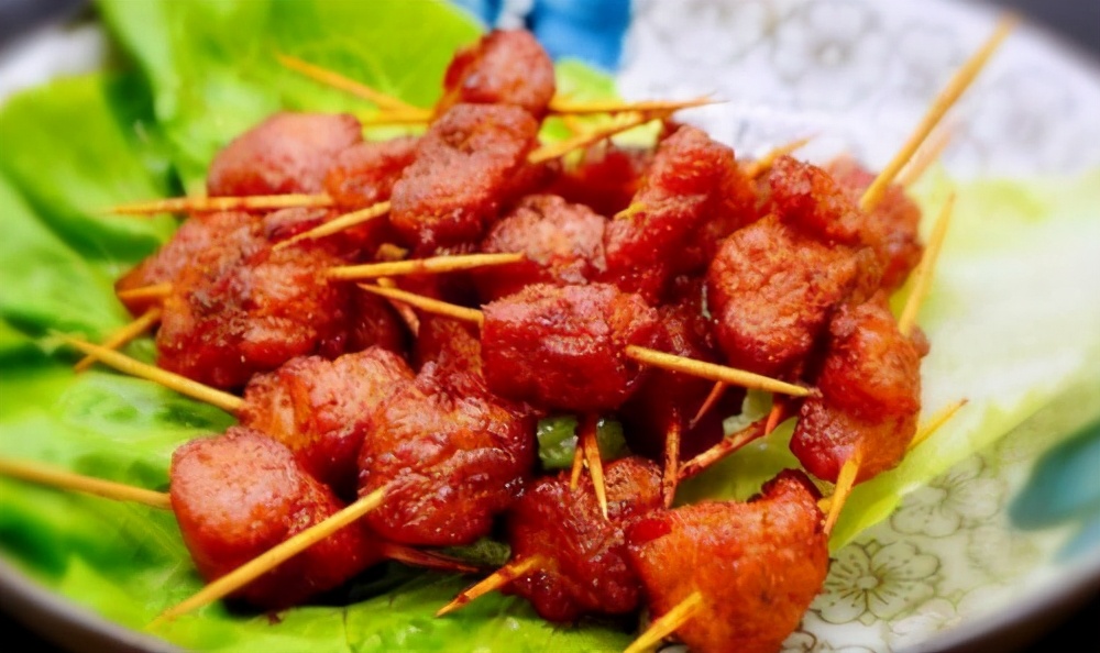 1、肉切合适大小的块,加生抽,盐,花椒粉用手抓匀,腌制30分钟。然后加入淀粉拌匀,用牙签串起。炸锅里热油