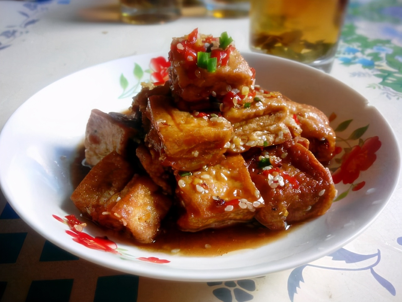 材料:豆腐2块、花生米20克、胡萝卜1根、莴笋1根、干辣椒5个、花椒适量、姜5片、料酒适量、生抽适量、盐适量、糖3克、生粉1勺、豆瓣酱1勺、油适量;