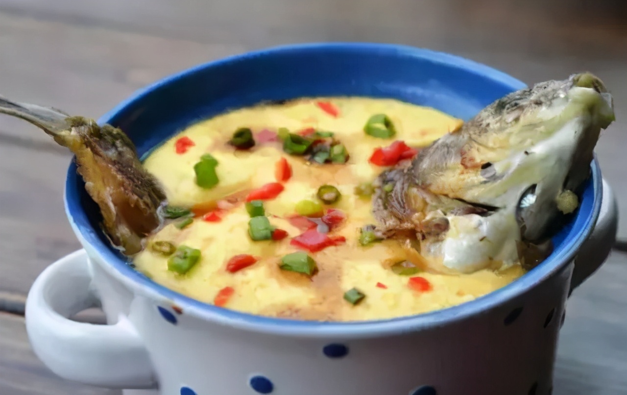 材料:鲫鱼 200克、鸡蛋 3个、料酒 5克、姜 5克、小葱 5克、食盐 3克、生抽 2克、红椒 少许、植物油 20克