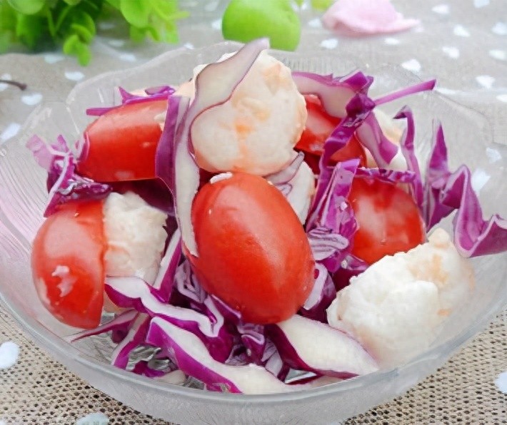 主料:虾仁100g 圣女果100g 紫甘蓝100g 姜适量 小葱适量 料酒1小匙 原味沙拉酱适量