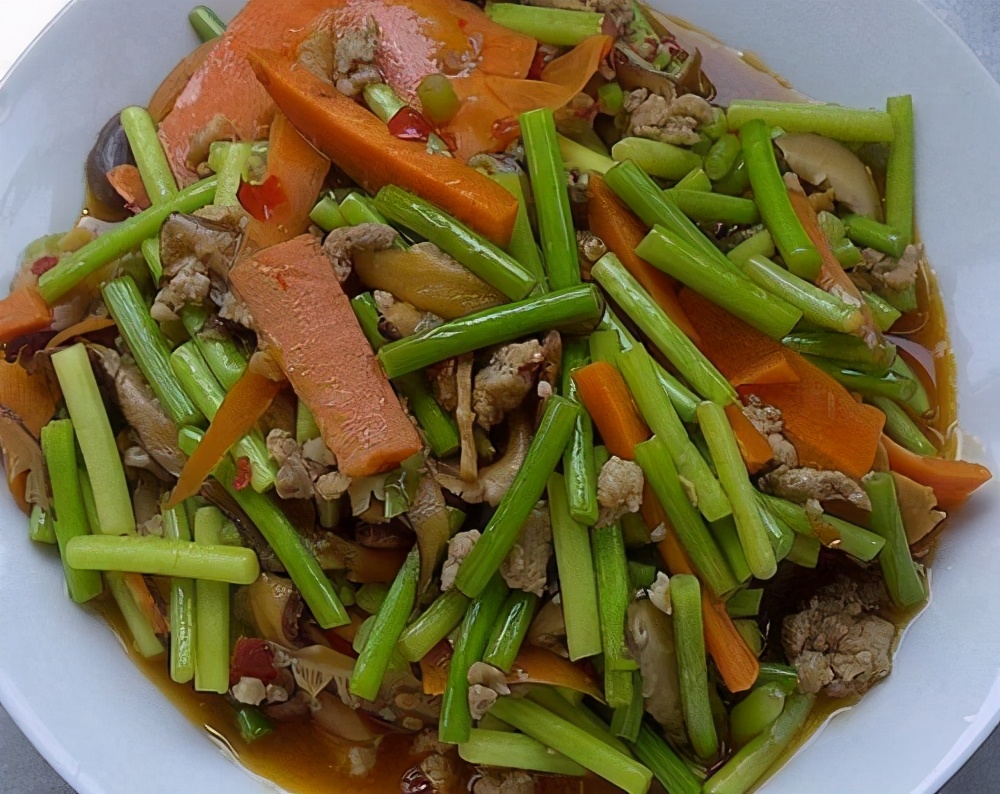 4.炒莴笋,胡萝卜;加入豆腐;勾芡出锅;
