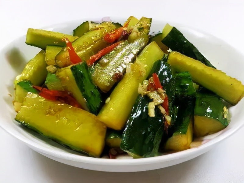 1、黄瓜洗净,切条,用盐拌匀,腌制半小时,控干杀出的水分。