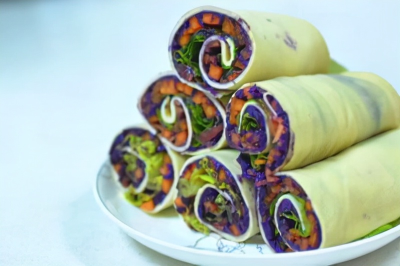 材料:豆腐皮3片 紫薯400克 胡萝卜100克、生菜5片