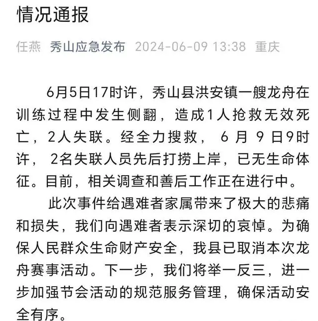 秀山县政府已经对事故进行了官方通报,并承诺将对事故进行重点复盘,加强安全管理,确保不再对安全工作有所懈怠。同时,官方也取消了原定的龙舟邀请赛,以示对安全问题的重视.