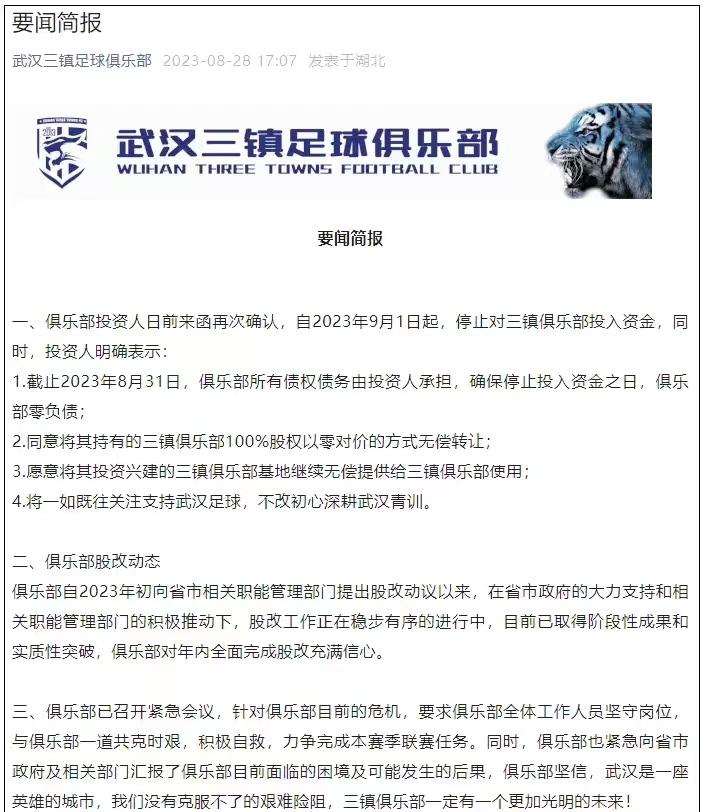 武汉三镇零元转让北京时间8月28日下午,武汉三镇俱乐部突然发出简报,大致内容:其背后投资方武汉尚文房地产开发有限公司将于9月1日停止投入资金不再投入资金,目前三镇俱乐部0负债,并希望以0元转让费转出俱乐部100%股份。